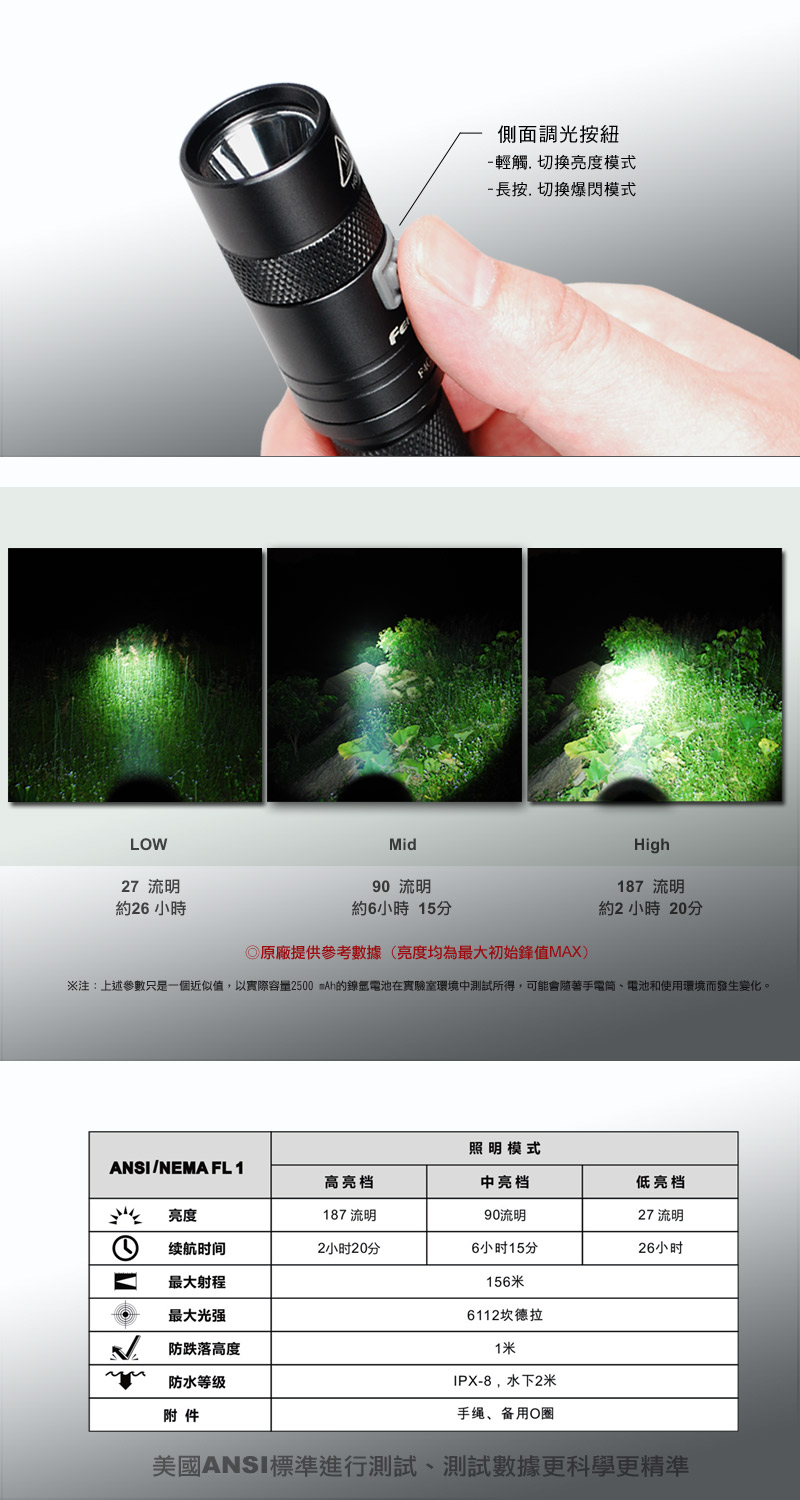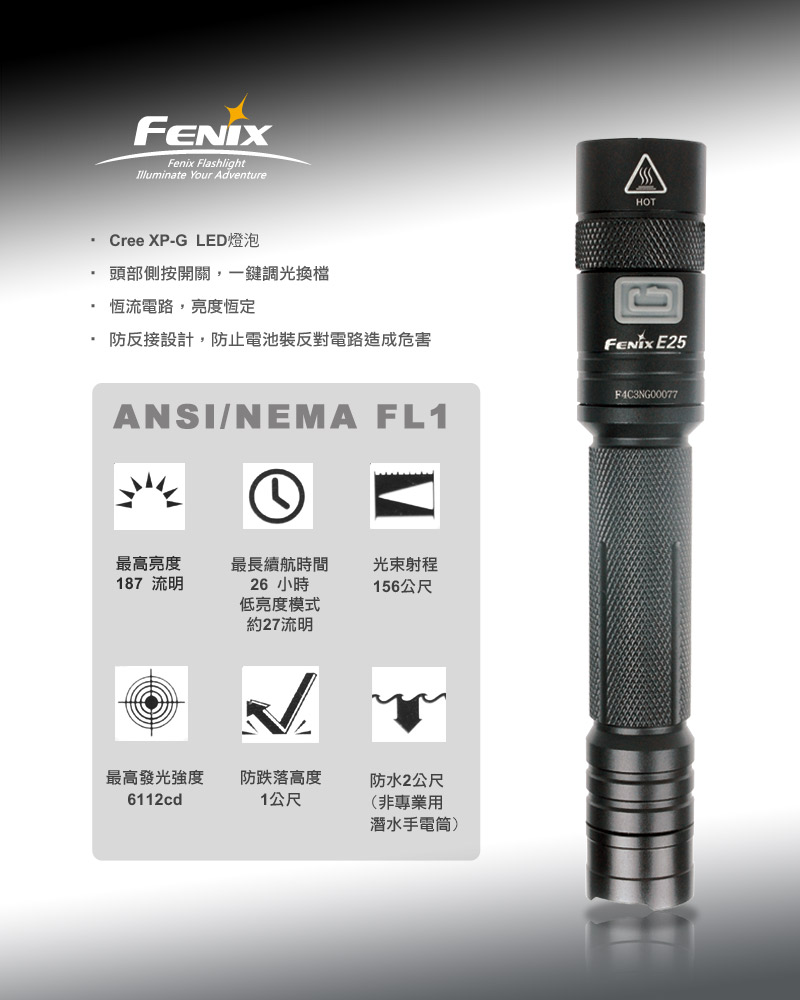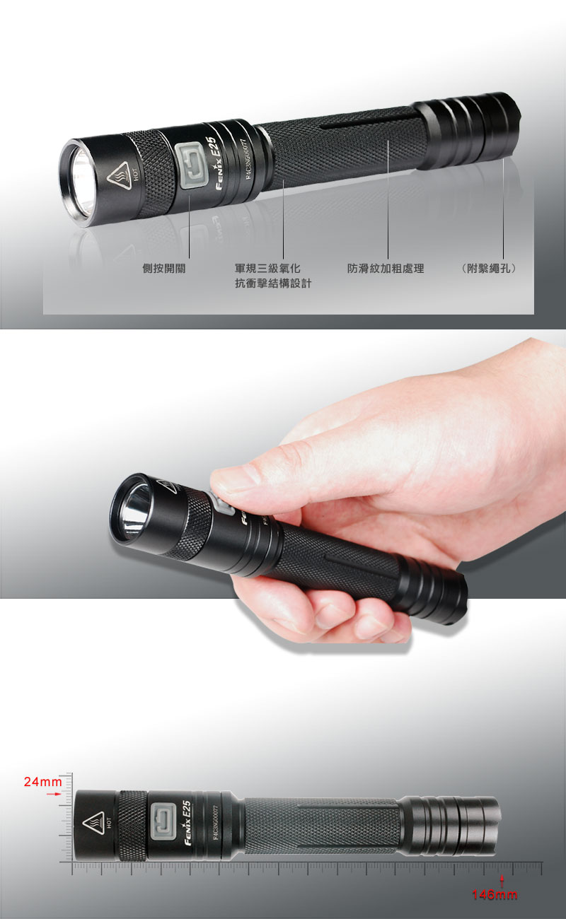 FENIX E25¬O¤@´ÚÀ³¥Î½d³ò·¥¼sªº¤p«¬¤á¥~¤â¹qµ©¡C3ºØ«G«×Àɦì¡A¥i¥H³q¹LÀY³¡°¼«ö¶}Ãö¤@Áä±±¨î¡A¤è«K§Ö±¶¡A«Ü¦n¦aÝÅU¤F»Ýn¤£¦P«G«×©MÄò¯è®É¶¡ªºÀ³¥Î³õ¦X¡CE25»´¥©«KÄâ¡A¨Ï¥Î¤è±ÁʶR¨Ã¥B»ù®æ¹ê´fªºAA¹q¦À¡A¦A¥[¤W¥ý¶iªºùÚ©w«G«×§Þ³N¡BIPX-8¯Å¨¾¤ô¡A¬Û«HE25¬O§AÀ³¹ï¦hºØ¤á¥~·Ó©ú»Ý¨Dªº³Ì¨Î¹Ù¦ñ¡C