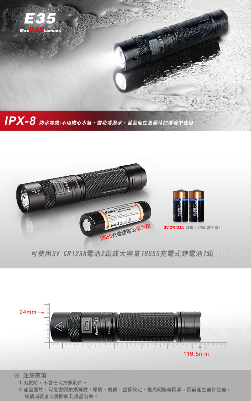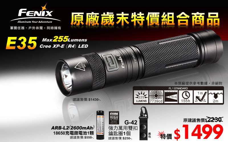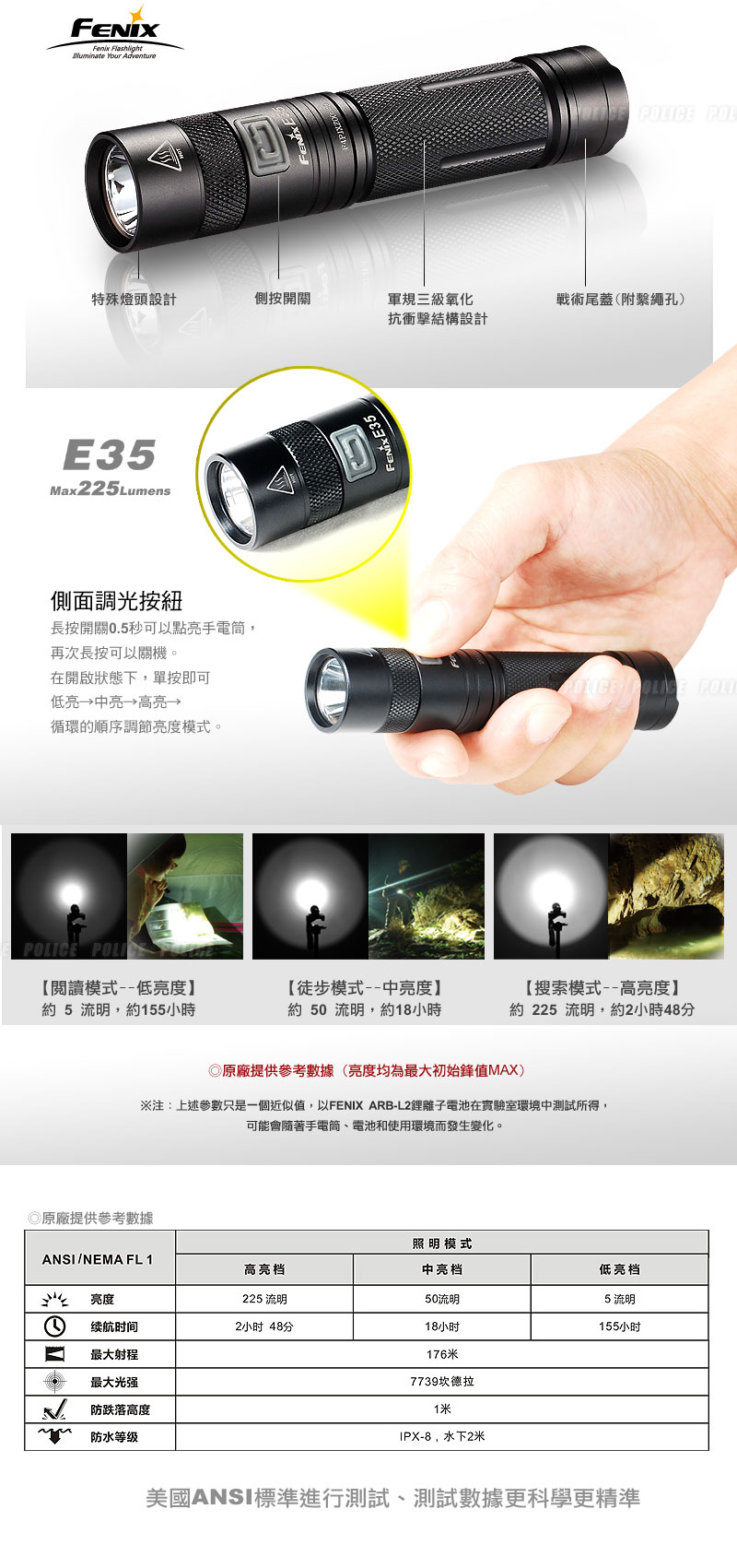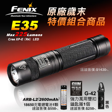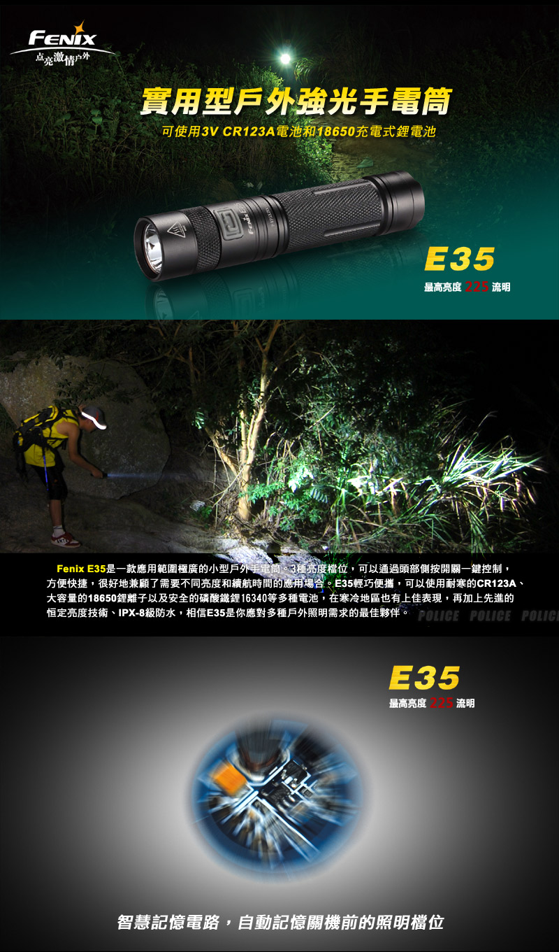 FENIX E35 ¬O¤@´ÚÀ³¥Î½d³ò·¥¼sªº¤p«¬¤á¥~¤â¹qµ©¡C 3 ºØ«G«×Àɦì¡A¥i¥H³q¹LÀY³¡°¼«ö¶}Ãö¤@Áä±±¨î¡A¤è«K§Ö±¶¡A«Ü¦n¦aÝÅU¤F»Ýn¤£¦P«G«×©MÄò¯è®É¶¡ªºÀ³¥Î³õ¦X¡C E35 »´¥©«KÄâ¡A¥i¥H¨Ï¥Î@´Hªº CR123A ¡B¤j®e¶qªº 18650 ¾YÂ÷¤l¥H¤Î¦w¥þªºÁC»ÄÅK¾Y 16340 µ¥¦hºØ¹q¦À¡A¦b´H§N¦a°Ï¤]¦³¤W¨Îªí²{¡A¦A¥[¤W¥ý¶iªºùÚ©w«G«×§Þ³N¡B IPX-8 ¯Å¨¾¤ô¡A¬Û«H E35 ¬O§AÀ³¹ï¦hºØ¤á¥~·Ó©ú»Ý¨D ªº³Ì¨Î¹Ù¦ñ¡C