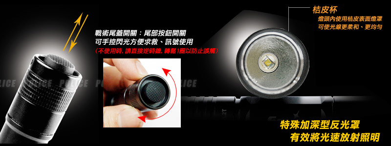 開啟手電筒後,輕觸尾蓋可點放照明。