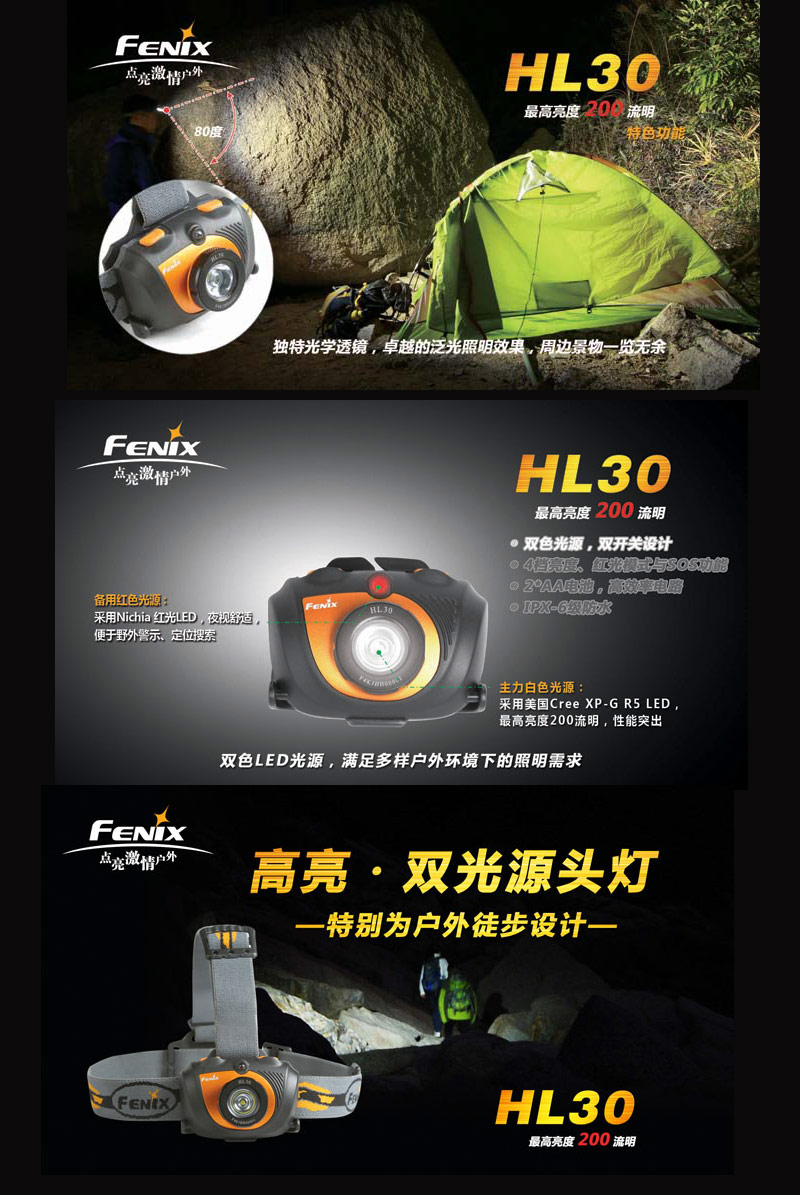 FENIX HL30 ¬O¤@´Ú°ª«G«×ªºÂù¥ú·½ÀY¿O¡C 4 Ó¤£¦Pªº«G«×Àɦì¡A¨¬¥H¾AÀ³¦UºØ¦a§Îªº·Ó©ú»Ý¨D¡F¦A¥[¤W±Mªù¥Î©ó©]µøªº¬õ¥ú¼Ò¦¡¤Î¨D±Ï¼Ò¦¡¡A³£¥i¥H¾aÂù¶}Ãö¤è«K§Ö³t¦a¤Á´« ¡C