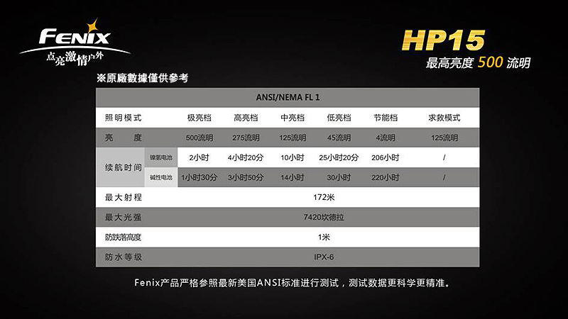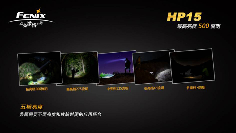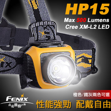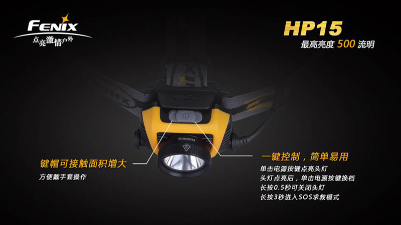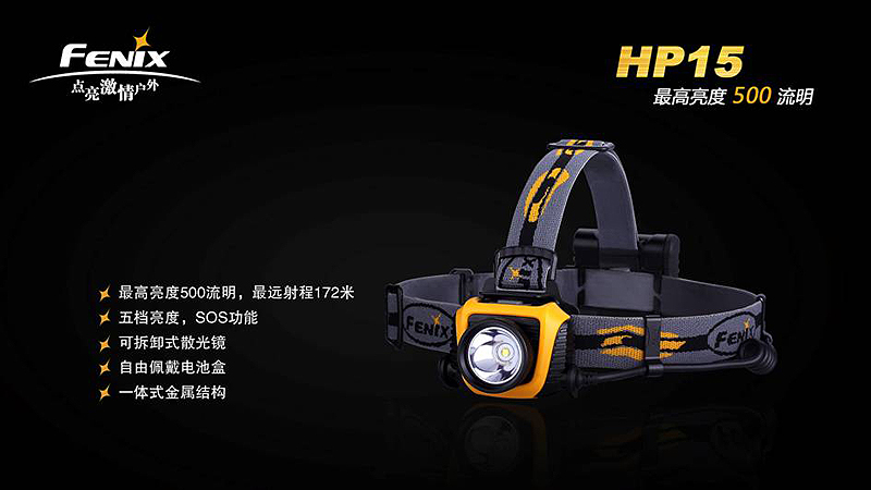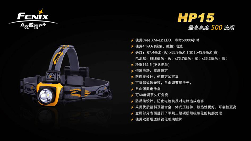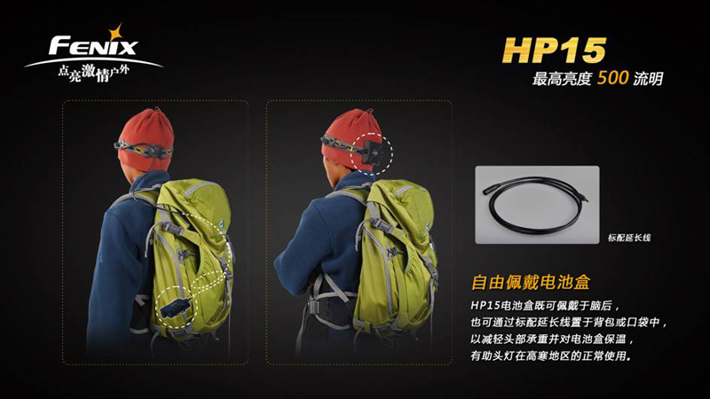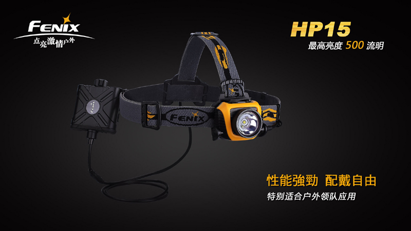 FENIX HP15 是一款使用 4 顆 AA 電池的高亮度分離式專業頭燈。它的電池盒既可配戴在後腦,也可通過延