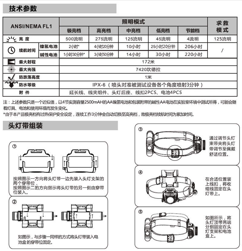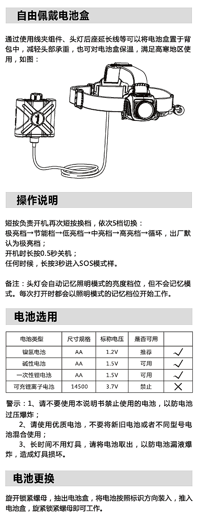 長線置於背包或口袋中,以減輕頭部承重並對電池盒保溫,有助於頭燈在高寒地區正常使用。另外通過標準