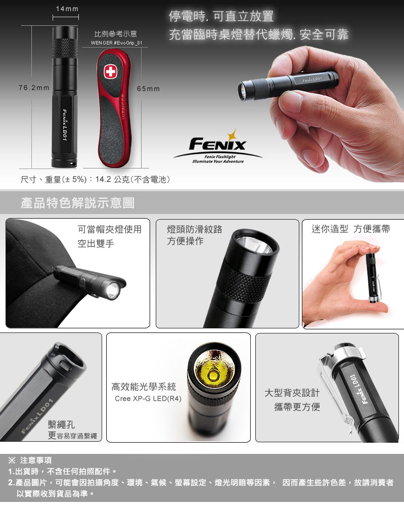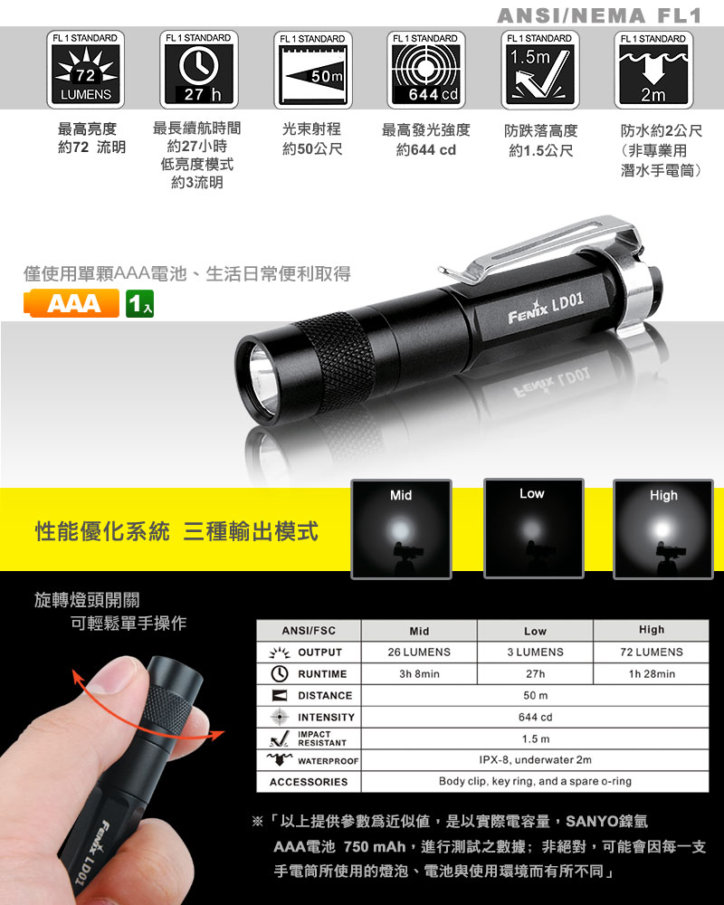 FENIX LD01 R4 是超小手電筒,只比它使用的 AAA 4 號電池大一點而已。