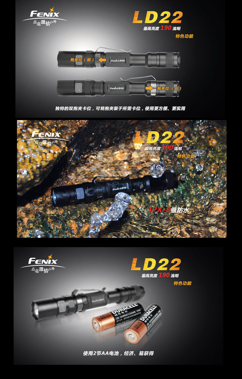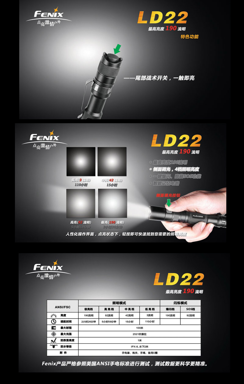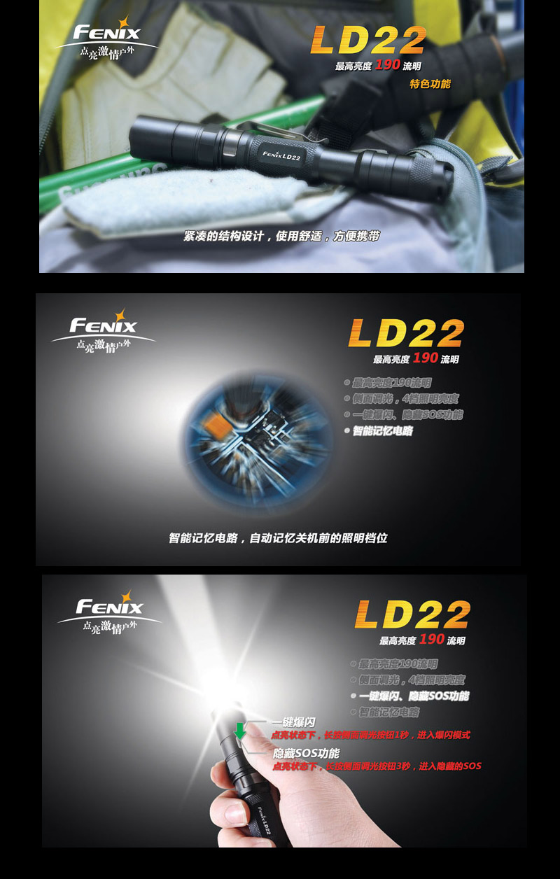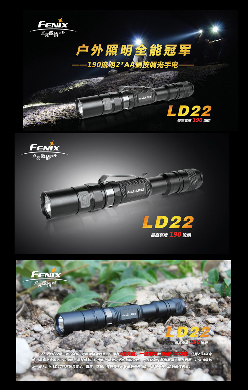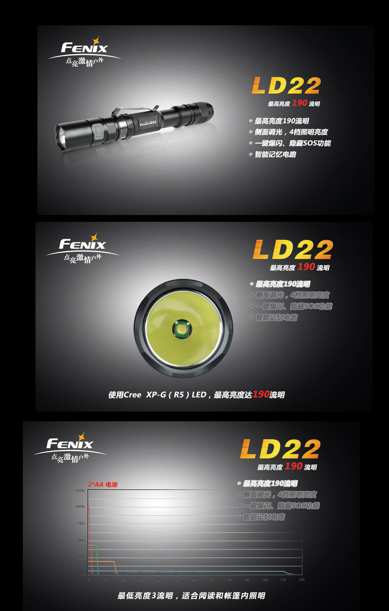 | FENIX LD22 ¬O¤@´ÚÀ³¥Î½d³ò·¥¼sªº¦h¥\¯à¤â¹qµ©¡C 4 ºØ«G«×Àɦ줸©M 2 ºØ°{Ã{¼Ò¦¡¡A¥i¥H³q¹LÀY³¡°¼«ö¶}Ãö¤@Áä±±¨î¡A¤è«K§Ö±¶¡A«Ü¦n¦aÝÅU¤F»Ýn¤£¦P«G«×©MÄò¯è®É¶¡ªºÀ³¥Î³õ¦X¡C LD22 ¨Ï¥Î©ö©óÀò¨úªº AA ¹q¦À¡A¦A¥[¤Wºë½o¤p¥©ªººò´ê³]p¡B¥ý¶iªºùÚ©w«G«×§Þ³N¡B IPX-8 ¯Å¨¾¤ô¡A¬Û«H LD22 ¬O§AÀ³¹ï¦hºØ¤á¥~·Ó©ú»Ý¨D¤Îºò«æª¬ªpªº¤W¨Î¹Ù¦ñ¡C