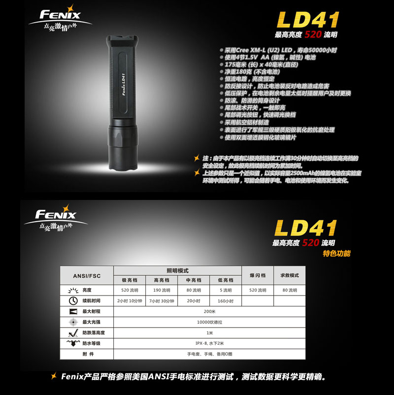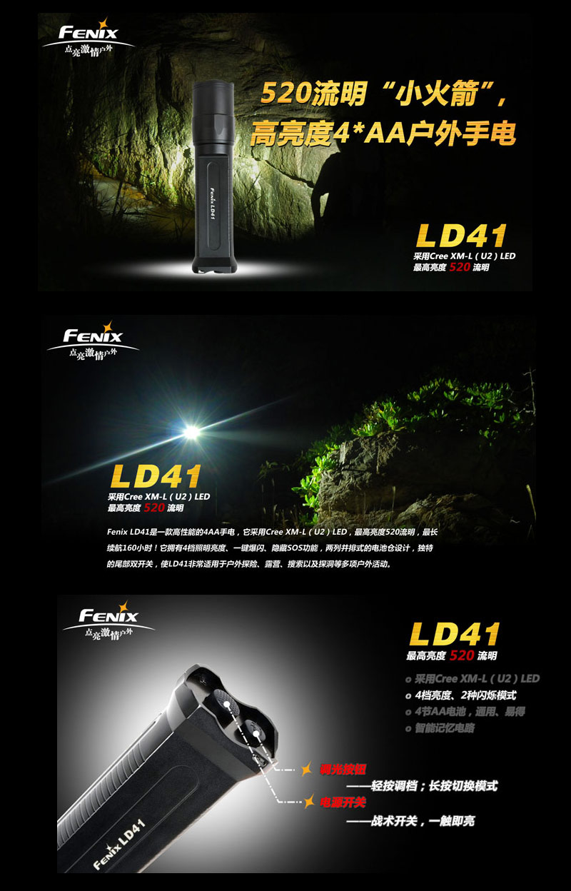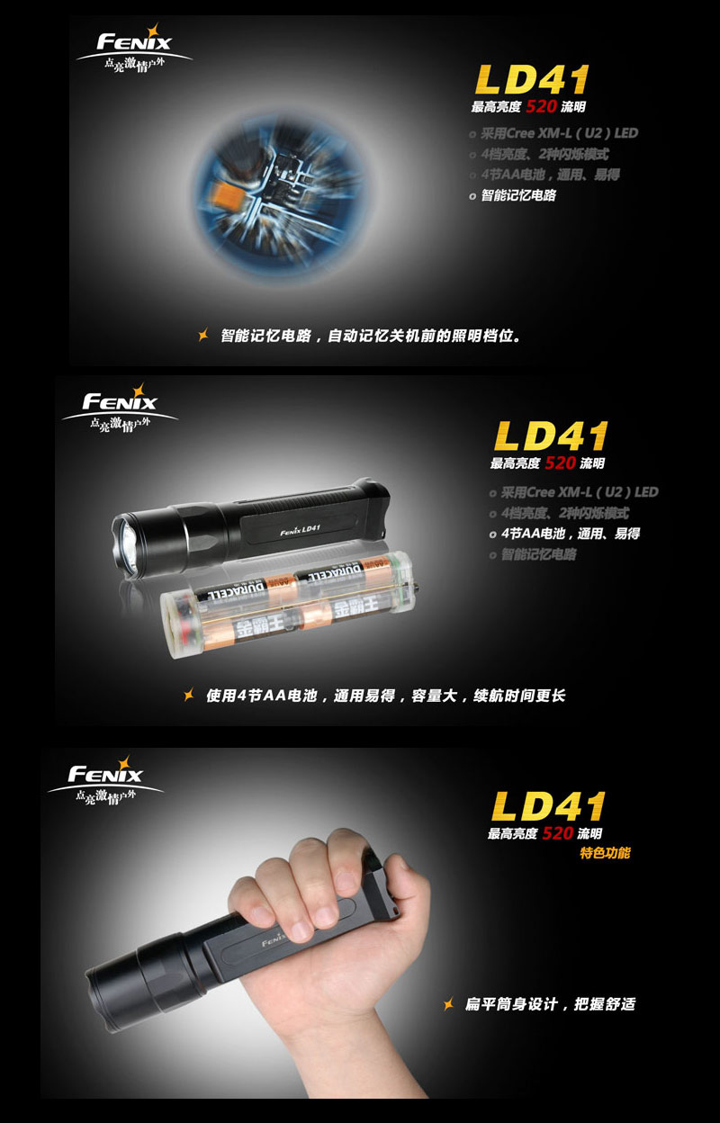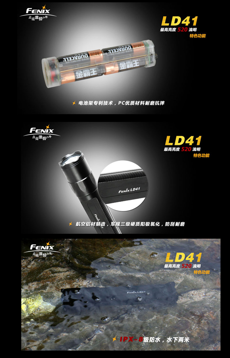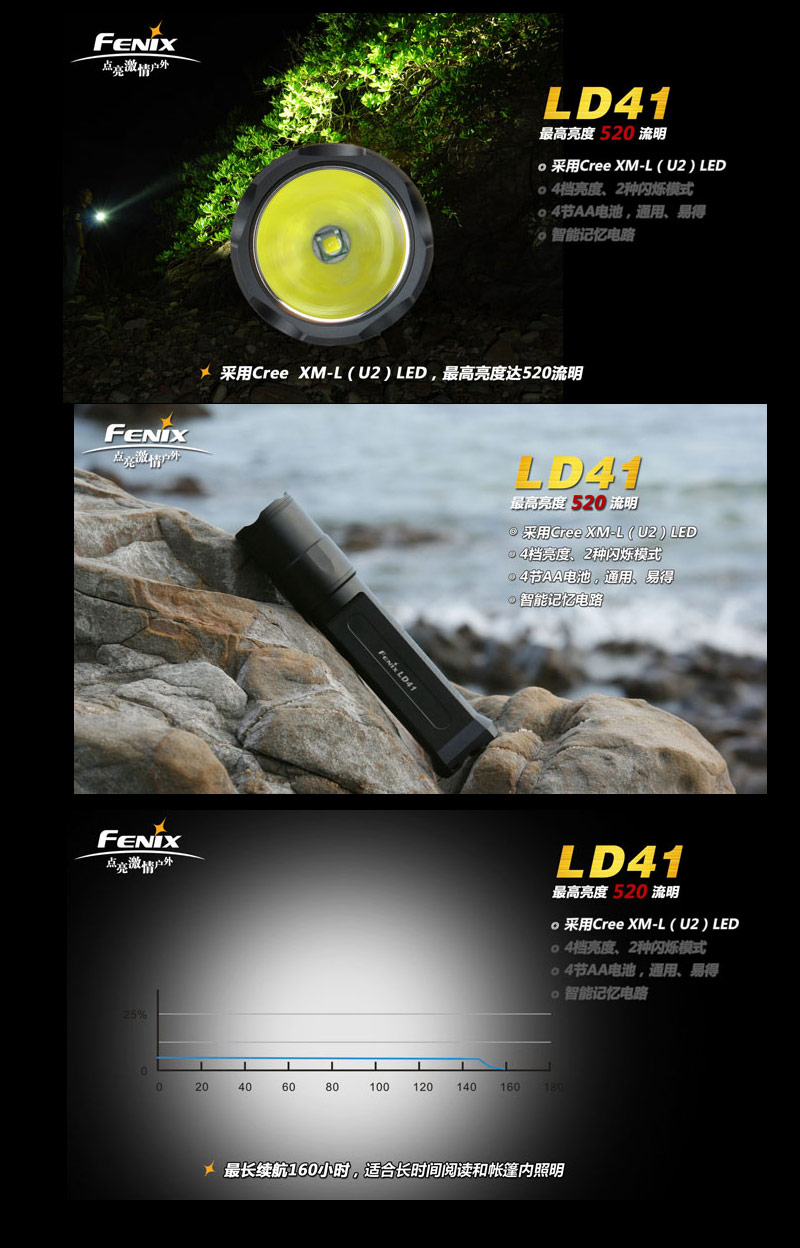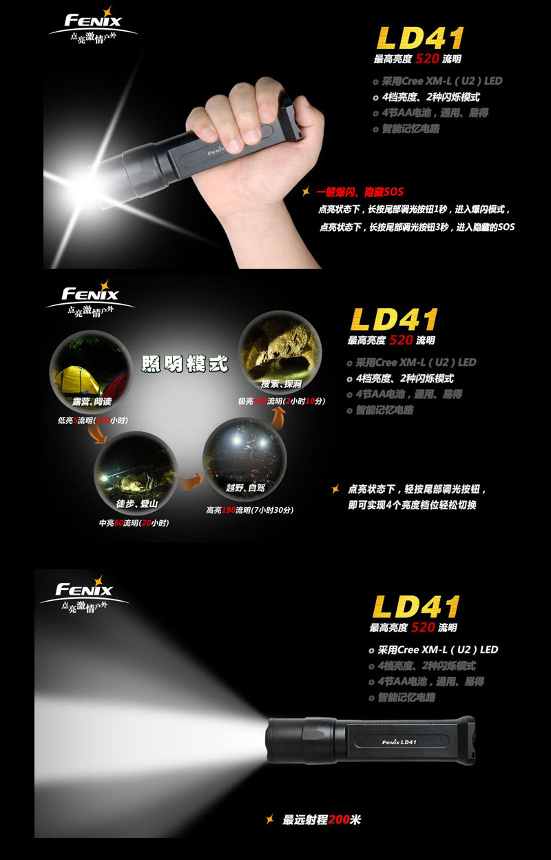 FENIX LD41 ¬O¤@´Ú°ª©Ê¯àªº¥þ¯à«¬¤á¥~¤â¹qµ©¡C§À³¡¿W¯SªºÂù¶}Ãö±±¨î¡A¬J«O¯d¤F¾Ô³N¶}Ãö¤@IJ§Y«Gªº¯S®íÀu¶Õ¡A¤S¥i¥H³q¹L½Õ¥ú«ö¶s¤è«K§Ö±¶ªº¦b 4 ºØ«G«×Àɦ줸©M 2 ºØ°{Ã{¼Ò¦¡¤§¶¡§Ö³t¤Á´«¡AÝÅU¤F»Ýn¤£¦P«G«×©MÄò¯è®É¶¡ªºÀ³¥Î³õ¦X¡C²Óªøªº¥þª÷ÄÝ¥~´ß¡A¦b®e¯Ç¤F 4 ¸`©ö©ó¨ú±oªº AA ¹q¦À¡A´£¨Ñ¥R¨¬ªº¹q¶qªº°ò¦¤W¡A´£¨Ñ¤F¶¶·ÆµÎ¾Aªº´¤«ù·P¡C¦A¥[¤W¥ý¶iªºùÚ©w«G«×§Þ³N¡B IPX-8 ¯Å¨¾¤ô¡A¬Û«H LD41 ¬O§AÀ³¹ï¦hºØ¤á¥~·Ó©ú»Ý¨D¤Îºò«æª¬ªpªº¤W¨Î¹Ù¦ñ¡C