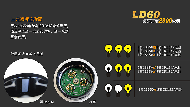 ¡·ºò«æ±¡ªp¤U¡A¥i¥H¥u¸Ë¤J¤@²Õ/¨â²Õ¹q¦À¡]¨CÓ¹q¦Àܤ¤¸Ë¤J1Áû18650©Î2ÁûCR123A¡^¨Ï¥Î¥»²£«~¡C¥Ñ©ó¥»²£«~¬°¤T¿O¤T¹q¸ô¿W¥ß¨Ñ¹q³]p¡A¥u¦³¸Ë¤J¹q¦Àªº¿OÀY·|¤u§@¡A©Ò¥H¦¹ª¬ºA¤U¡A¥ú³q¶q·|´î¤Ö¨ì¤T¤À¤§¤@/¤T¤À¤§¤G¡A¦ýÄò¯è®É¶¡¤£ÅÜ¡C