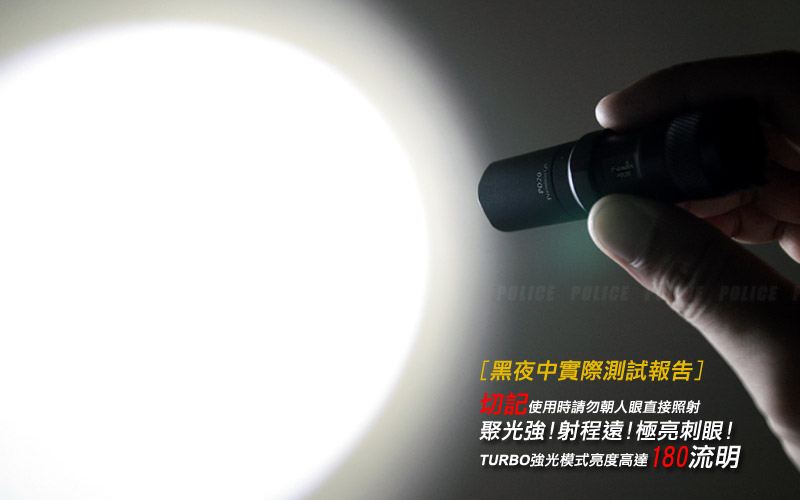 使用金頂(DURACELL) 3V CR123A鋰電池1顆,Turbo加強光模式下流明達180流明,搭配數位控管使亮度穩定,靠旋轉燈頭來選擇(專利),有效將電池電源作6段式的亮度輸出喔!