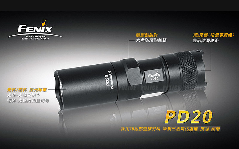 採用T6航太等級鋁材質,表面三級陽極氧化表面處理,加上IPX-8級防水標準與耐磨、防刮、增透光學玻璃製作,而U型尾蓋除了手感極佳的菱紋設計,更方便按鈕開關及加大繫繩孔。