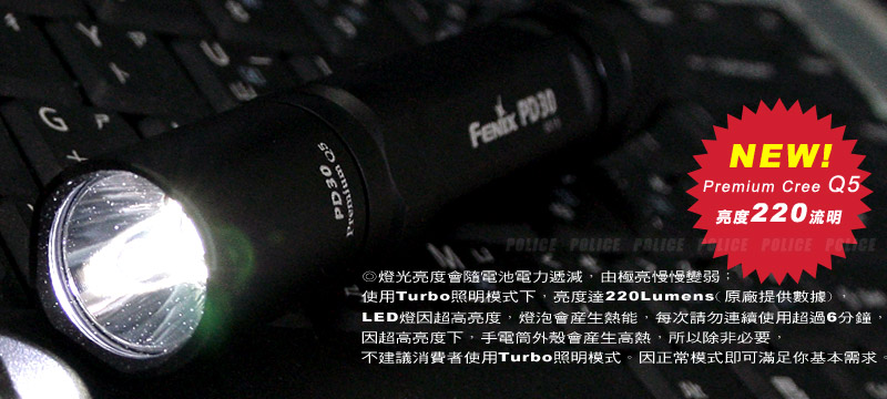 使用金頂(DURACELL) 3V CR123A鋰電池2顆,Turbo加強光模式下流明達220流明,搭配數位控管使亮度穩定,靠旋轉燈頭來選擇(專利),有效將電池電源作6段式的亮度輸出喔!