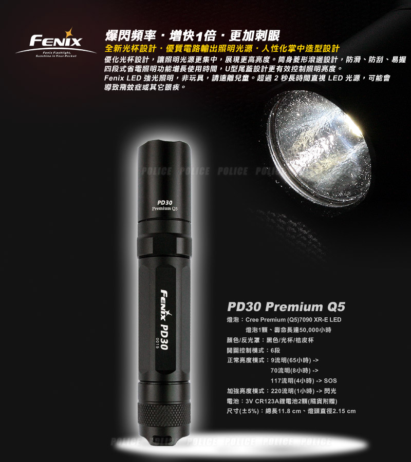 一年內雙重保固標誌-筒身內貼有【POLICE】易碎貼紙;外殼上有刻專屬序號(皆不相同),方便辨識與管理。