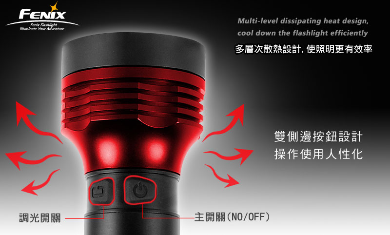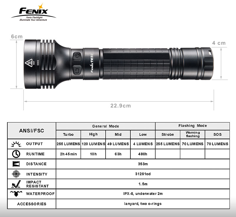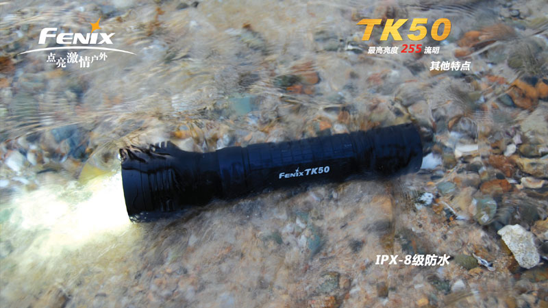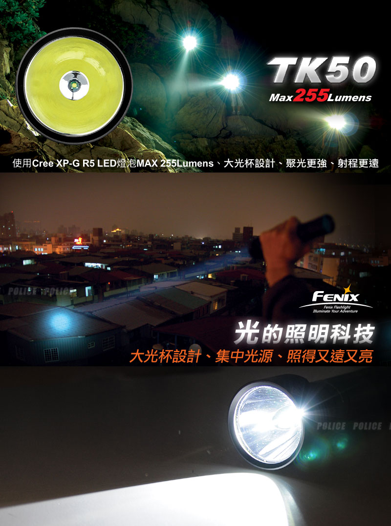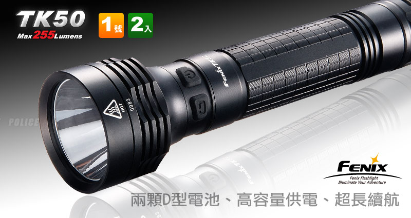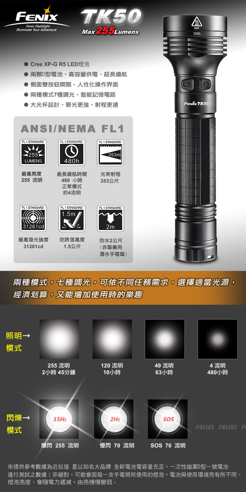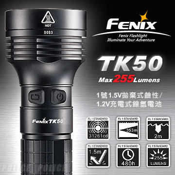 FENIX TK50 是一款輕便的高亮多功能兩顆 1 號電池手電筒,有 4 段亮度模式,可達到最大約 255 流明的亮度,或最長約 20 天的續航時間,再加上 3 種閃爍和信號模式,完全滿足戶外各種環境的照明需求,各種不同的功能,可以通過前置式雙按鈕方便快速地切換,而體積又小於大多數傳統 1 號電池手電筒,性能更加卓越,操作更加便捷人性化,使 TK50 成為戶外搜索、洞穴探險或汽車備用燈 … 等各種角色的全能型照明利器。