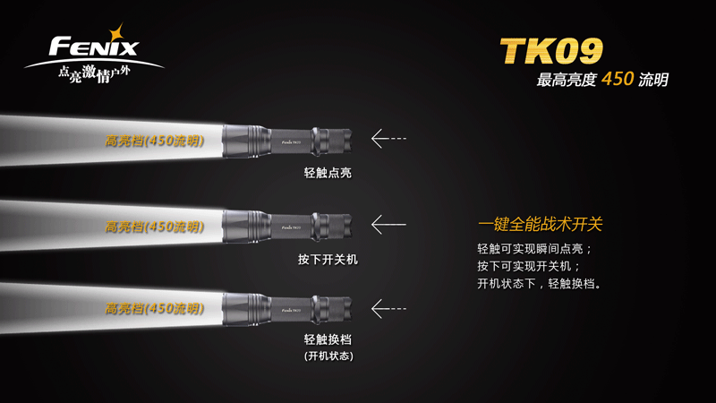 基礎操作:輕觸尾部開關可點亮手電,釋放開關手電即熄滅;