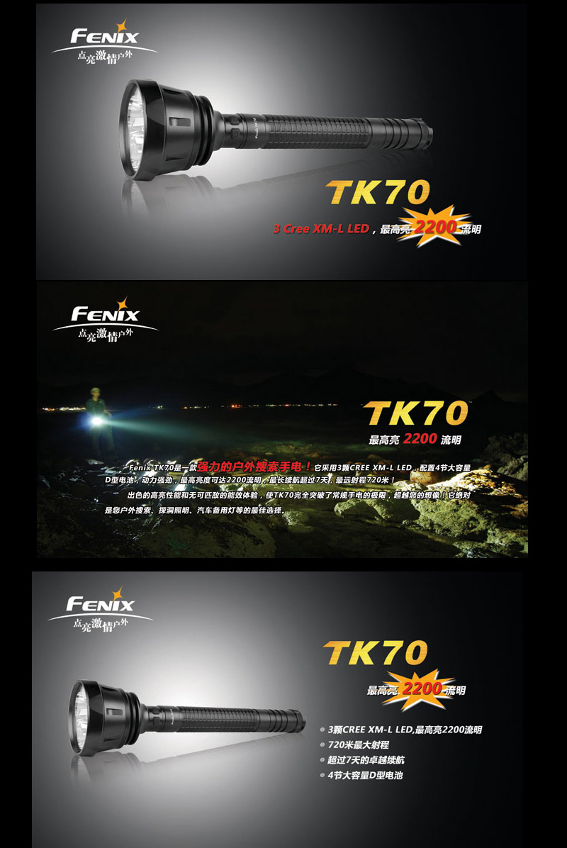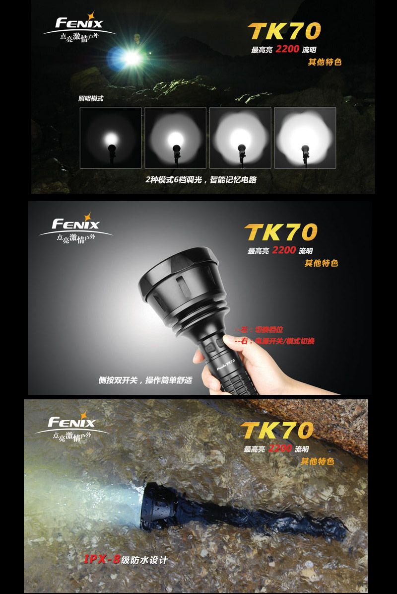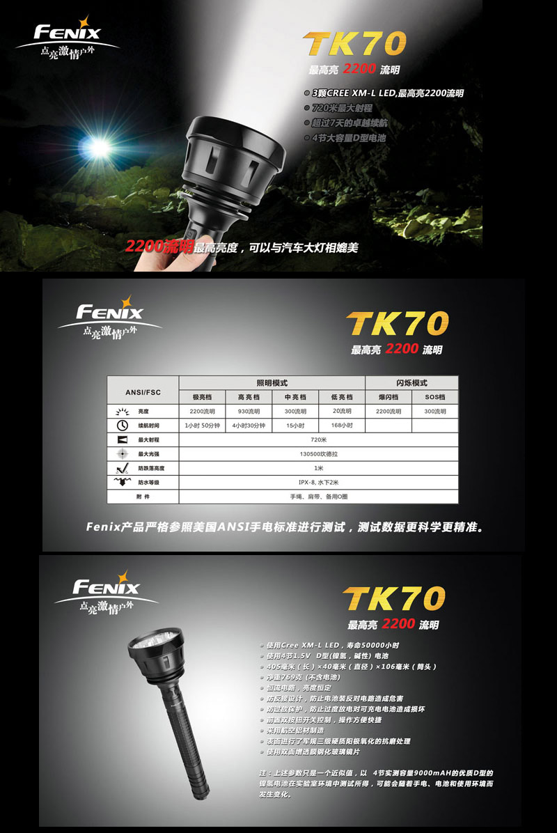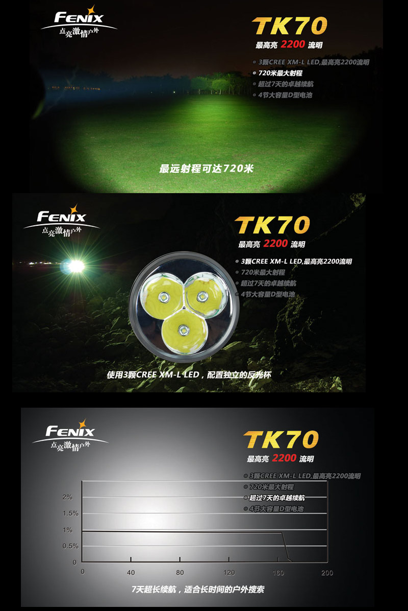 | FENIX TK70¬O¤@´Ú¶W°ª«G«×ªº¦h¥\¯àD«¬(1¸¹)¹q¦À¤â¹qµ©¡CÀV³¡ªºÂù¶}Ãö¥i¥H¤è«K§Ö³t¦a¦b4Ó¤£¦Pªº«G«×¬q¦ì©M2ºØ°{Ã{¤Î«H¸¹¼Ò¦¡¤§¶¡¤Á´«¡A³Ì°ª¹F¬ù¨ì2200¬y©úªº«G«×©M³Ìªø¬ù7¤ÑªºÄò¯è®É¶¡¡A¨Ï¤§¨¬¥H¾A¥Î©ó¤£¦PÀô¹Ò¤Uªº¦UºØ·Ó©ú»Ý¨D¡C¦P®É¡Aºë±Kºò½oªº³]p¡A³Ì¤jµ{«×ªºÁY´î¤FTK70Åé¿n©M«¶q¡A§âÀu¨qªº©Ê¯à©M¨Ï¥Î·P¨ü§¹¬ü¦aµ²¦X¦b¤@°_¡A¨Ï¤§¦¨¬°¥i¥H§êºt¤á¥~·j¯Á¡B±´¬}·Ó©ú¡B¨T¨®³Æ¥Î¿Oµ¥¦UºØ¨¤¦âªº¥þ¯à¦y§L¡C