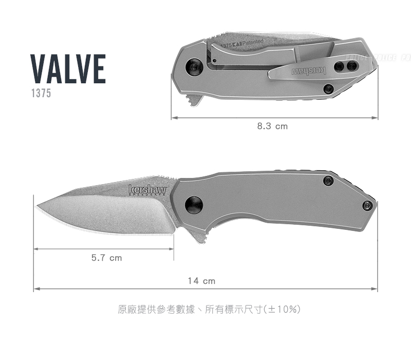 ※本產品說明,僅供參考,請勿作為正式採購招標規格,如有需要,請來電我司洽詢相關業務人員。 ※以下原廠提供參考數據。 品名:Kershaw VALVE 折刀 型號:#1375