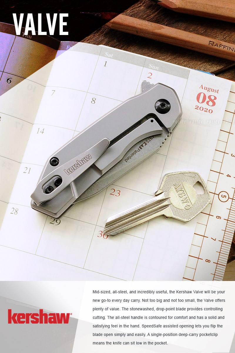 中型、全鋼且實用,Kershaw Valve將成為您每日攜帶的新歡,此款折刀不大不小剛剛好,石洗處理drop-point型的刀刃有良好的切割能力,全鋼握柄手感舒適。SpeedSafe輔助開啟使您可以輕鬆簡單地將折刀展開,此款折刀背夾可放置在淺口袋中不易掉出,黑色螺釘使整體刀款增添些不同風味。 》簡單、易於攜帶的小刀,手感舒適、外觀時尚。 》SpeedSafe®輔助開啟和導板輕鬆快速地開啟。 》4Cr13鋼刀刃具有良好的耐腐蝕性,高強度;石洗刀刃可稍作隱藏刮痕。 》握柄材質手感舒適,在使用過程中可確保牢固抓握。