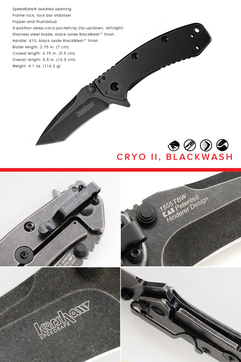 受歡迎的 Cryo ll 戰術短刃折刀表面黑洗處理,實用並具多功能性短刃刀提供強而有力的性能,極具特色的刀刃外觀有助於隱藏使用過程中增加的任何刮痕,為 Rick Hinderer 設計師與 Kershaw 共同合作的成果,配置了安全快速開啟機制,可單手輕而易舉的開?刀刃。