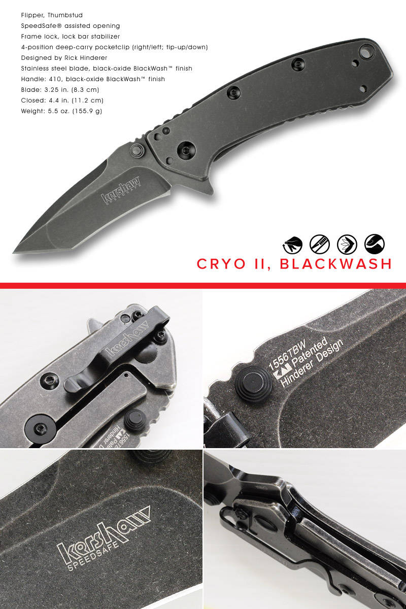 受歡迎的 Cryo ll 戰術短刃折刀表面黑洗處理,實用並具多功能性短刃刀提供強而有力的性能,極具特色的刀刃外觀有助於隱藏使用過程中增加的任何刮痕,為 Rick Hinderer 設計師與 Kershaw 共同合作的成果,配置了安全快速開啟機制,可單手輕而易舉的開?刀刃。