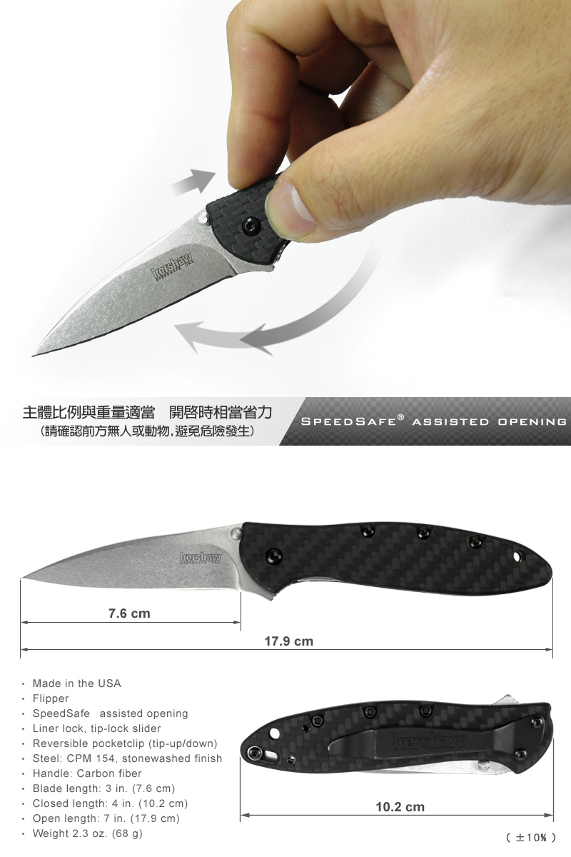 美國製造 SpeedSafe® assisted opening 鎖定:Locking liner 鋼材:CPM154鋼,石洗 柄材:碳纖維 尺吋/重量:(±10﹪) 刃長:7.6 cm 全長:17.9cm 收合長:10.2 cm 重量:68 g