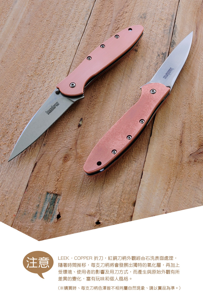 ※注意:Leek - Copper 折刀,紅銅刀柄外觀經由石洗表面處理,隨著時間推移,每支刀柄將會發展出獨特的氧化層,再加上 受環境、使用者的影響及用刀方式,而產生與原始外觀有所 差異的變化,富有玩味和個人風格。 (※購買時、每支刀柄色澤皆不相同屬自然現象、請以實品為準。)