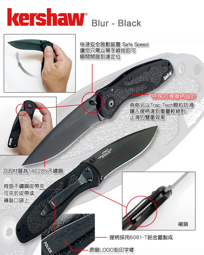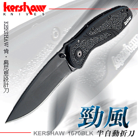 品名:KERSHAW 勁風半自動折刀 型號:1670BLK 顏色:黑色 尺寸 ( ±10﹪):全長19.9. cm、刃長8.5 cm、柄長11.4 cm 重量 ( ±10﹪):112 g 刀刃材質:14C28N不鏽鋼 刀柄材質:6061-T鋁金屬 ※未滿18歲 兒童及少年,請勿購買刀械。