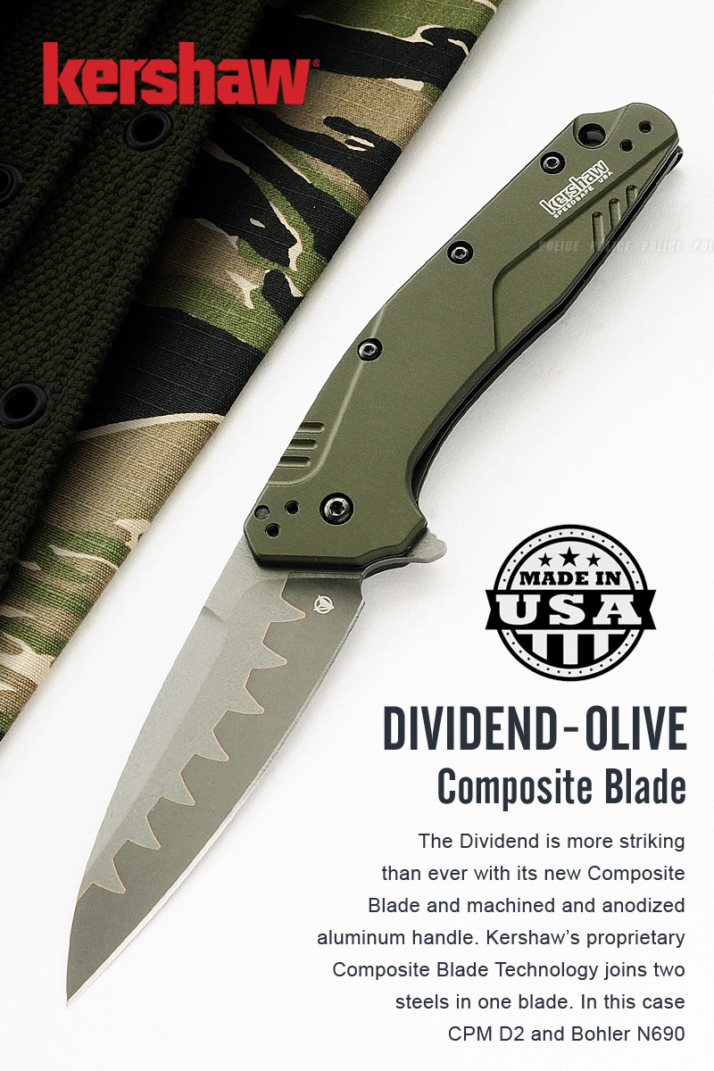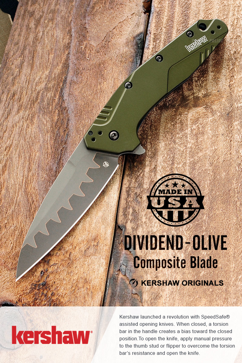 全新的複合材料刀刃以及經過機械加工和氧化處理的鋁製握柄,使Dividend比以往任何時候都更加引人注目,Kershaw專有的複合材料刀刃技術將兩種鋼材合二為一,使用CPM D2和Bohler N690,我們將Bohler N690放在刀刃上層,以利用其耐腐蝕性和出色的硬度;我們將D2放在刀刃的刀口上,以利用其耐磨性、韌性和出色的切削刃保持性,並加入“齒狀”樣式,以獲得類似戰鳥的風格。 高級EDC、美國製造複合刀刃技術將兩種鋼永久性地結合在一個刀刃中。堅硬,耐腐蝕的N690位於刀刃上層,刀刃邊緣以D2製成輕巧堅固的鋁製握柄,經過機械加工,具有堅固的抓握力,並在橄欖色上做氧化處理借助SpeedSafe®輔助開啟,使其可輕鬆單手打開折刀。