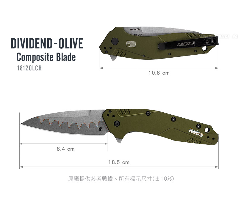 ※本產品說明,僅供參考,請勿作為正式採購招標規格,如有需要,請來電我司洽詢相關業務人員。 ※以下原廠提供參考數據。 品名:Kershaw DIVIDEND 折刀 型號:#1812OLCB