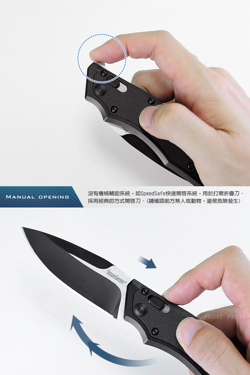 手動開啟: 沒有機械輔助系統,如SpeedSafe 快速開啟系統,用於打開折疊刀。採用經典的方式開啟刀。 背夾位置可調整: 握柄中的預先鑽孔可讓使用者改變刀頭位置或攜帶刀的面向。