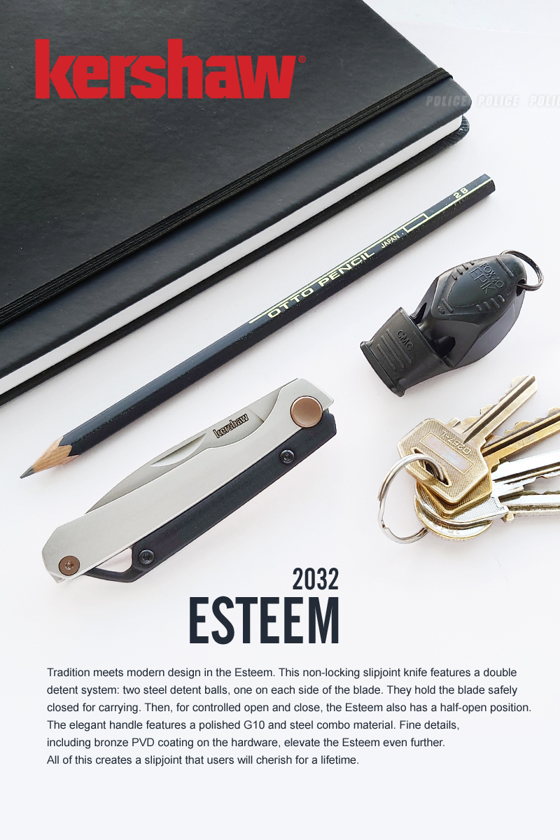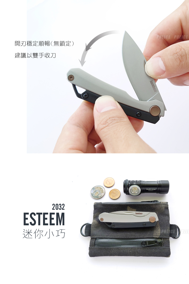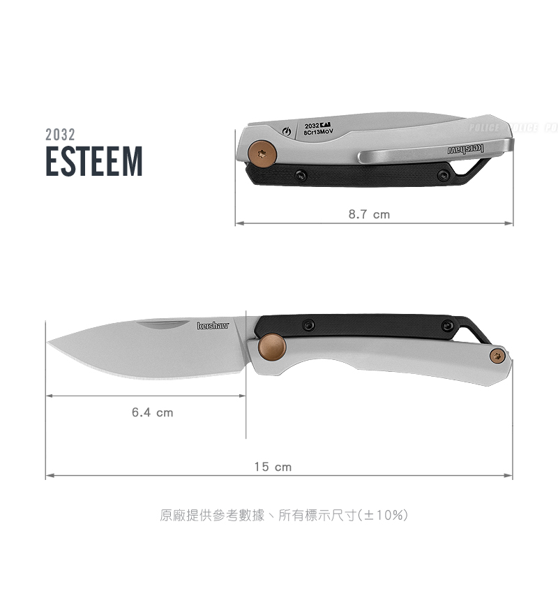 ※本產品說明,僅供參考,請勿作為正式採購招標規格,如有需要,請來電我司洽詢相關業務人員。 ※以下原廠提供參考數據。 品名:Kershaw ESTEEM 折刀 型號:#2032 刀刃鋼:8Cr13MoV 刀刃處理: 噴砂處理 握 柄:不鏽鋼、噴砂處理、拋光 G10覆蓋 刃長(10%):6.4 cm 全長(10%):15 cm 重量(10%):55 g 開啟: 手動開啟 鎖定: 滑動接頭 ( 無鎖定 ) ※未滿18歲 兒童及少年,請勿購買刀械。 製圖 2022/06/02