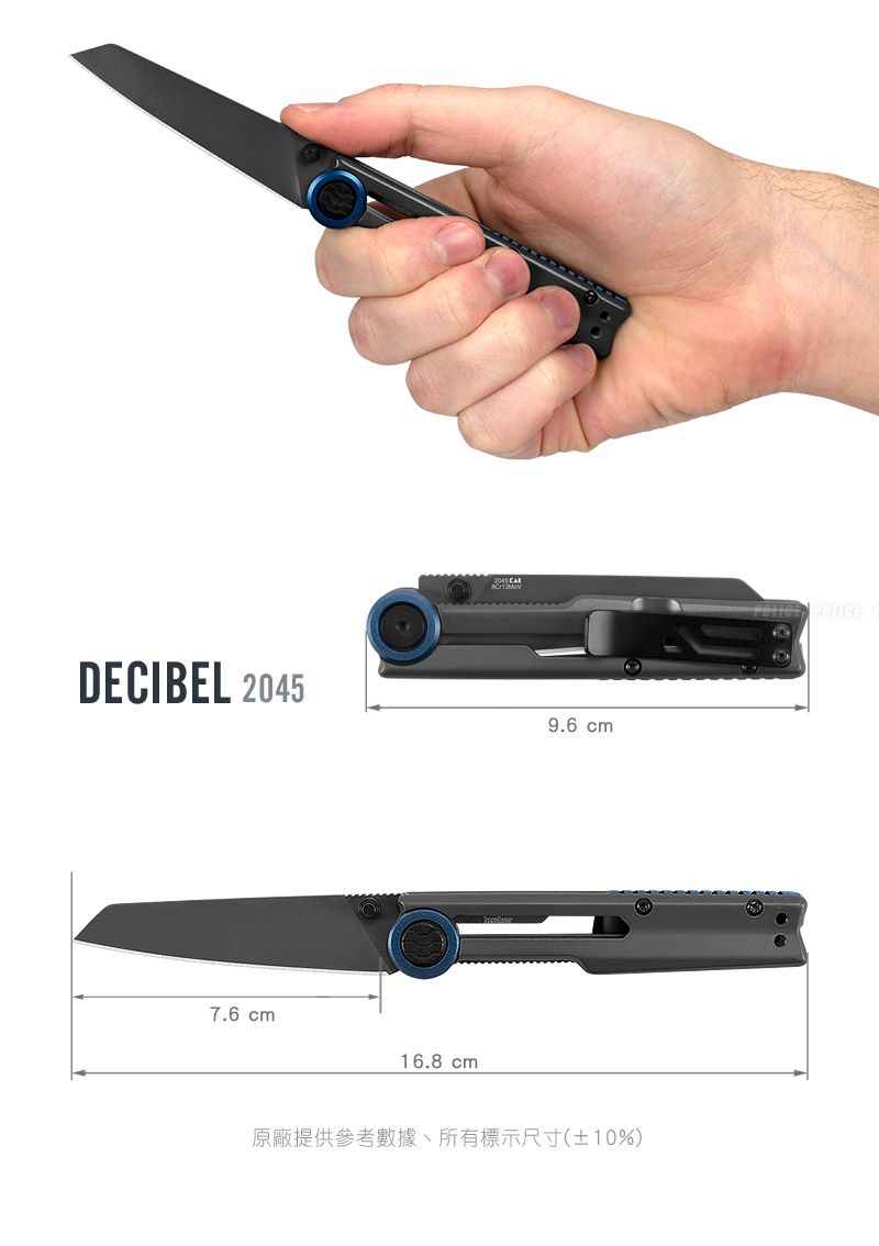 尺寸 ( ±10﹪):刀刃長7.6cm、收合長9.6 cm、全長16.8 cm 重量(±10%):83 g