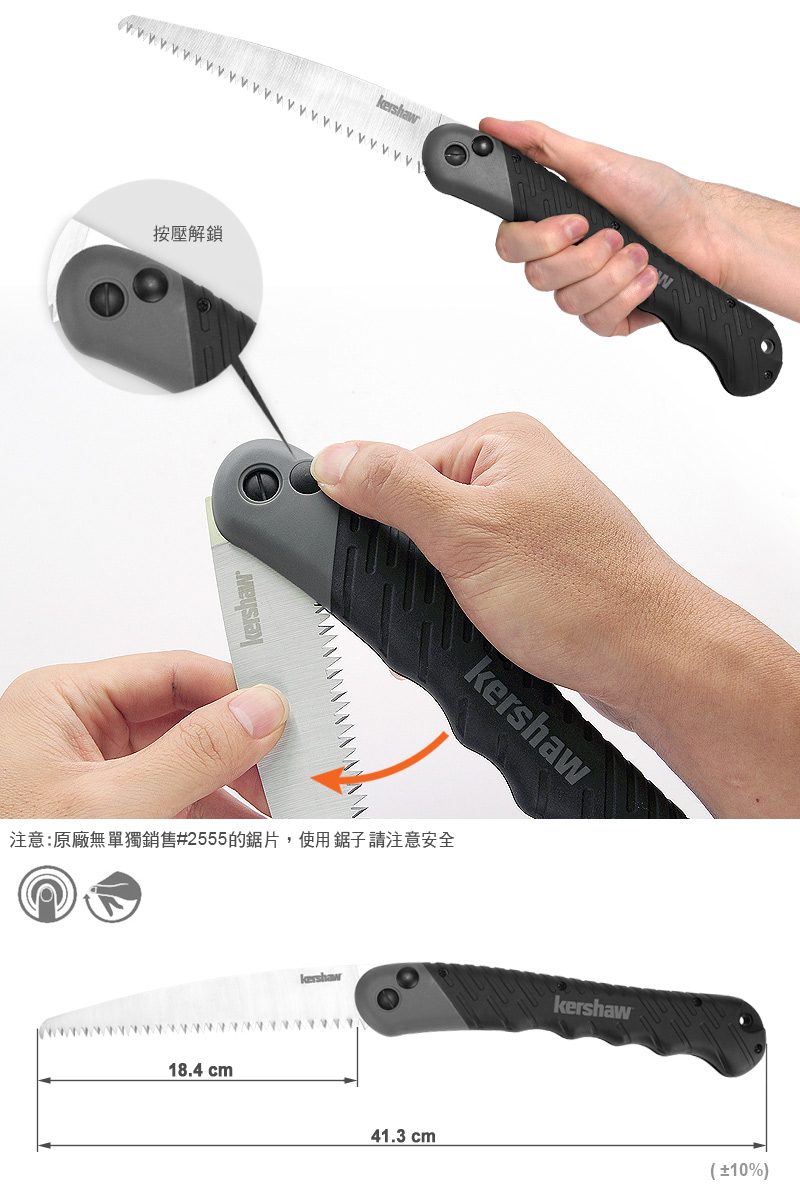 品名:Kershaw TASKMASTER SAW折鋸 型號:2555 鋼材: 高碳鋼 柄材: 玻璃填充尼龍,橡膠覆蓋 刃長 ( ±10﹪):18.4cm 全長 ( ±10﹪):41.3cm 重量 ( ±10﹪):260.8g