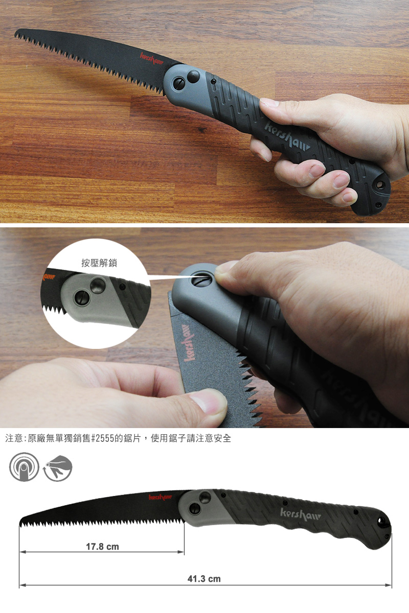 Kershaw TASKMASTER SAW折鋸 鋼材: 高碳鋼 柄材: 玻璃填充尼龍,橡膠覆蓋 刃長 ( ±5﹪):17.8cm 全長 ( ±5﹪):41.3cm 重量 ( ±5﹪):260.8g