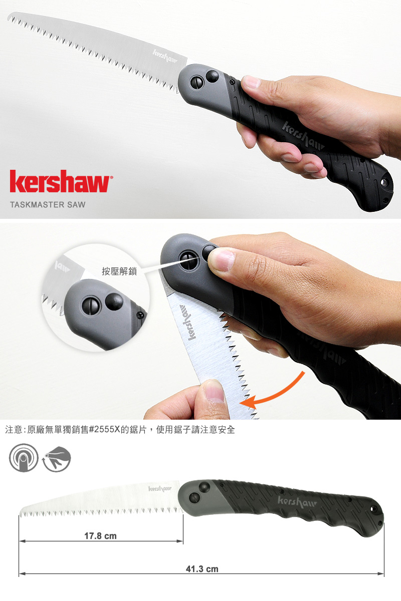 Kershaw TASKMASTER SAW折鋸 鋼材: 高碳鋼 柄材: 玻璃填充尼龍,橡膠覆蓋 刃長 ( ±10﹪):17.8cm 全長 ( ±10﹪):41.3cm 重量 ( ±10﹪):260.8g