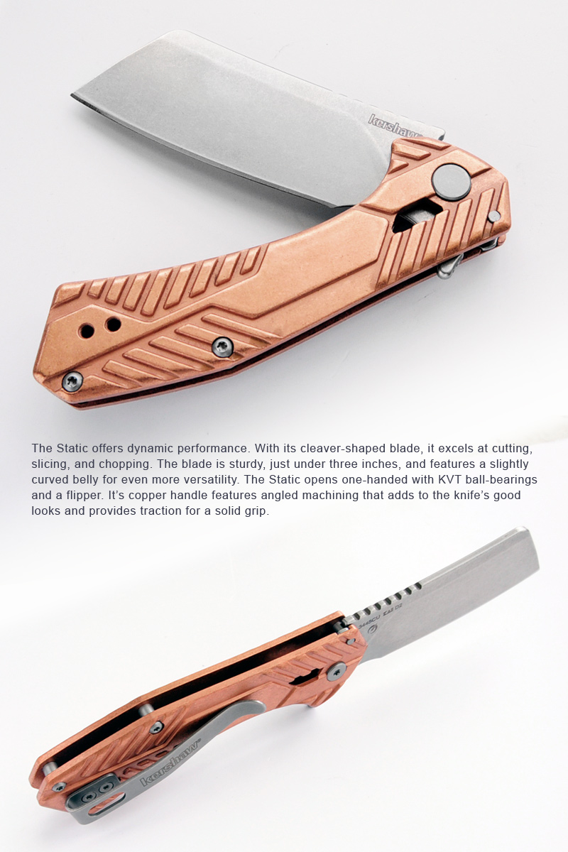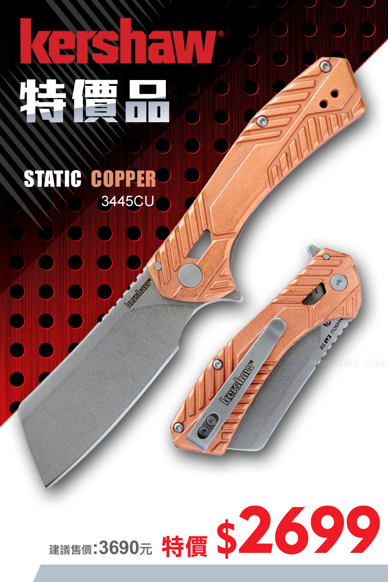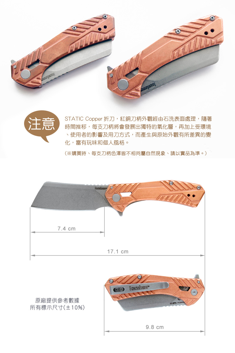 ※注意:STATIC Copper折刀,紅銅刀柄外觀經由石洗表面處理,隨著時間推移,每支刀柄將會發展出獨特的氧化層,再加上 受環境、使用者的影響及用刀方式,而產生與原始外觀有所 差異的變化,富有玩味和個人風格。 (※購買時、每支刀柄色澤皆不相同屬自然現象、請以實品為準。)