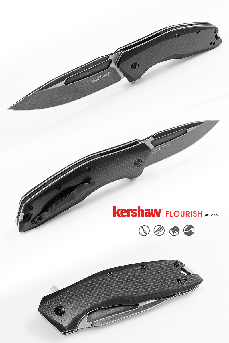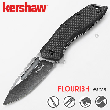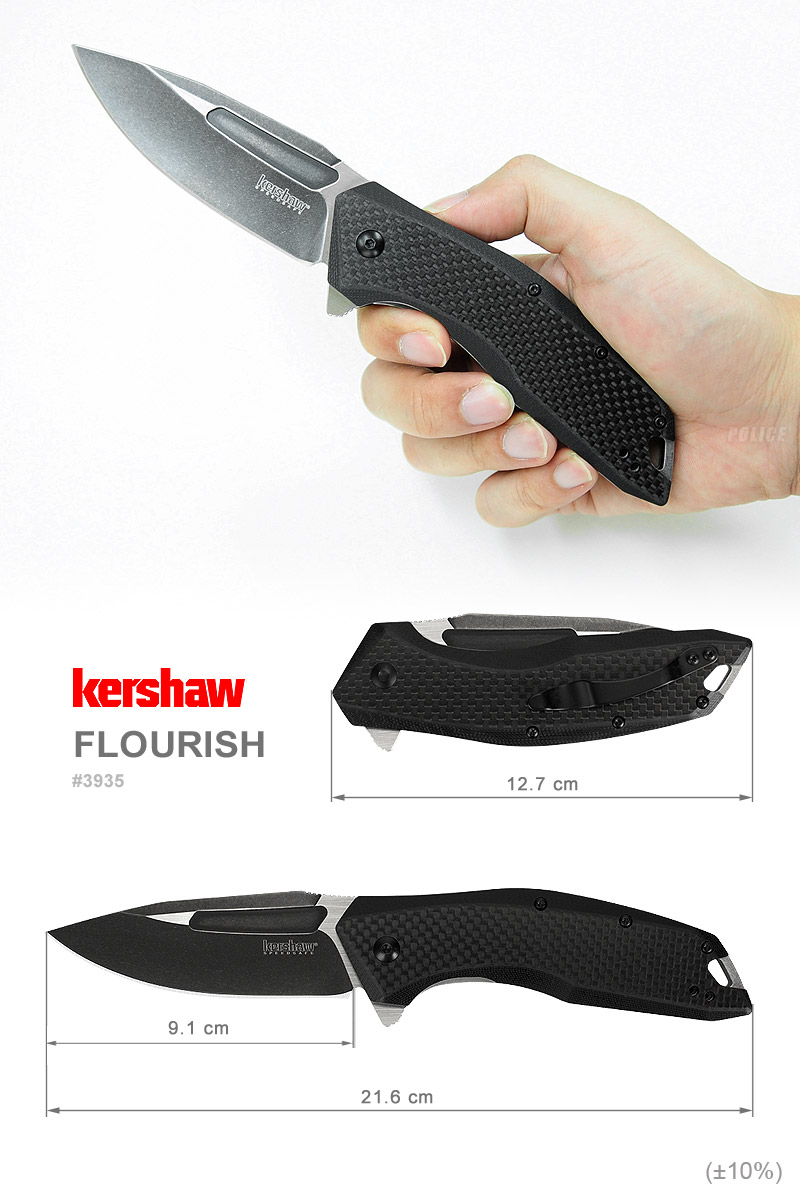 ※本產品說明,僅供參考,請勿作為正式採購招標規格,如有需要,請來電我司洽詢相關業務人員。 ※以下原廠提供參考數據。 品名:Kershaw FLOURISH 折刀 型號:#3935 鋼材:8Cr13MoV 鋼,表面黑色氧化、拉絲塗層 握材:G-10,表面碳纖維疊層 刀刃長(±10%):9.1 cm 收合長(±10%):12.7 cm 開啟長(±10%):21.6 cm 重量(±10%):153 g • 繫繩孔 • SpeedSafe ® 快速開啟系統 • 內襯鎖定 • 鰭狀撥桿 • 背夾位置可調整 (左/右方) ※未滿18歲 兒童及少年,請勿購買刀械。 製圖日期:2017.08.16