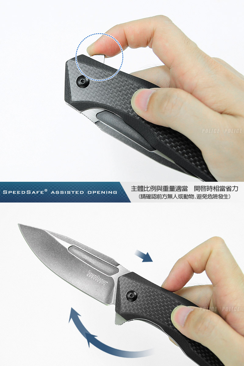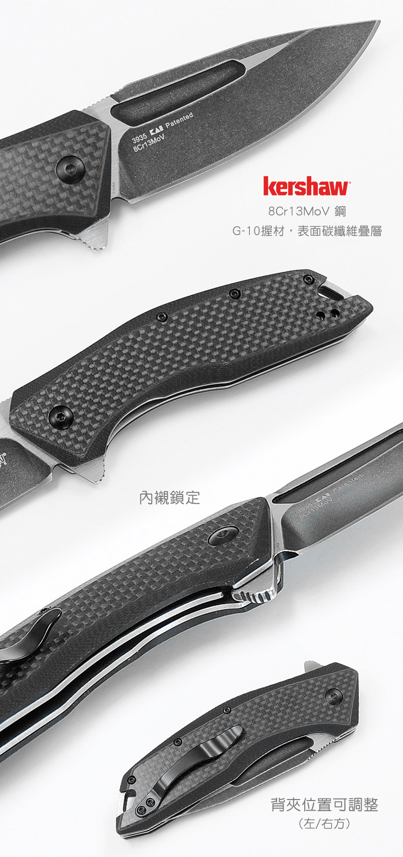 鰭狀撥桿: 可用於手動或助力開啟刀款。“鰭狀撥桿”是刀片背面上的突出部,使用者可以拉回或翻轉,以便將刀片容易地從握柄中移出。 SpeedSafe®快速開啟系統: 幫助您快速輕鬆地打開任何有SpeedSafe®快速開啟系統的刀款,用手指推動拇指柱或拉回鰭狀撥桿。在許多Kershaw 暢銷款都有這個設計。 內襯鎖定: 在刀刃開啟使用時鎖定,握柄內一側有鋼製”襯片”,該鋼片在握柄框內會移動到刀片尾端銜接位置,牢固地將其鎖定開啟了。 背夾位置可調整: 握柄中的預先鑽孔可讓使用者改變刀頭位置或攜帶刀的面向。