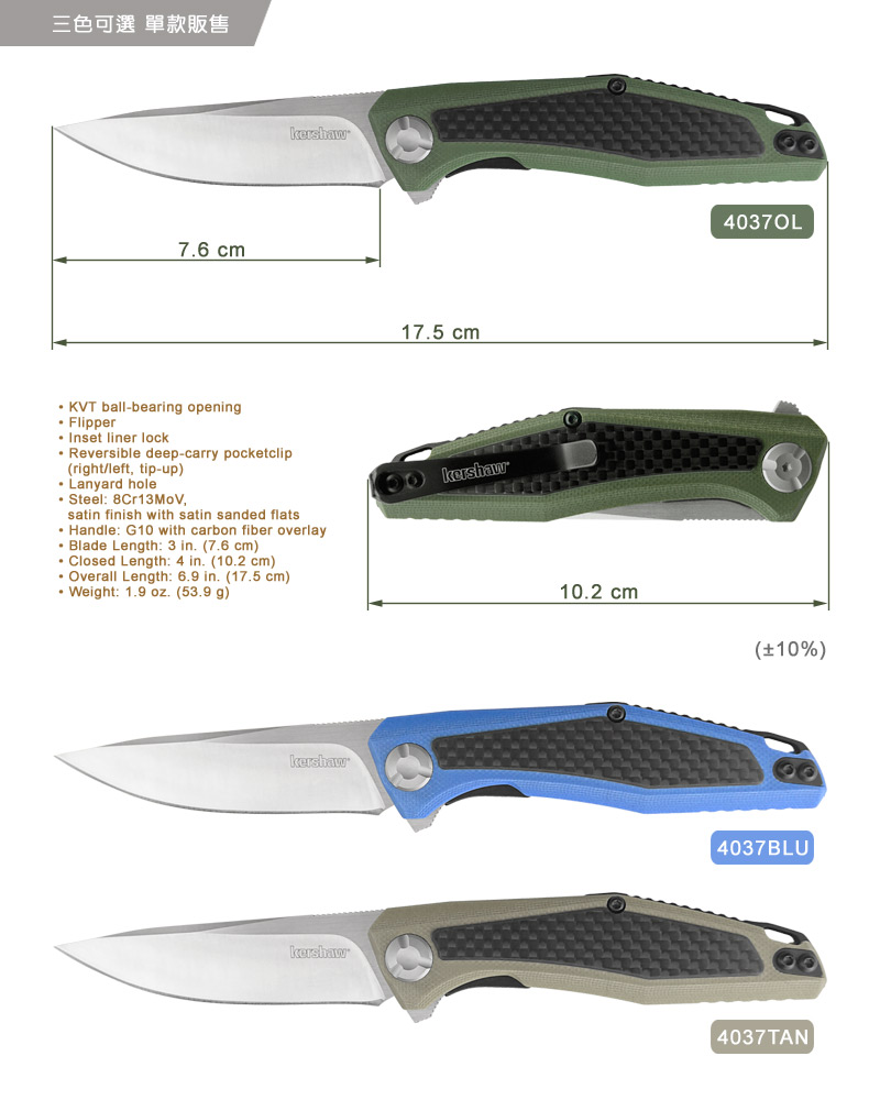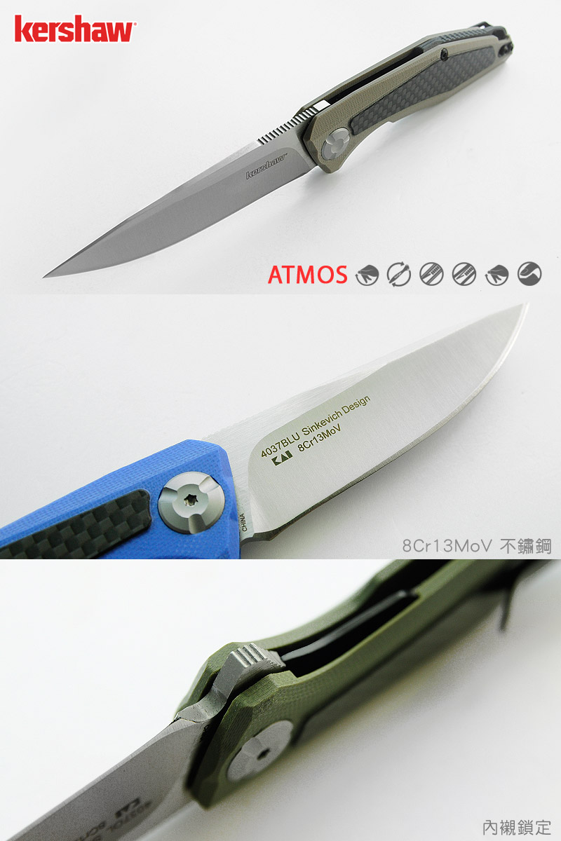 Kershaw ATMOS 折刀/彩色刀柄 型號:#4037BLU/藍色 #4037TAN/狼棕 #4037OL/橄欖綠
