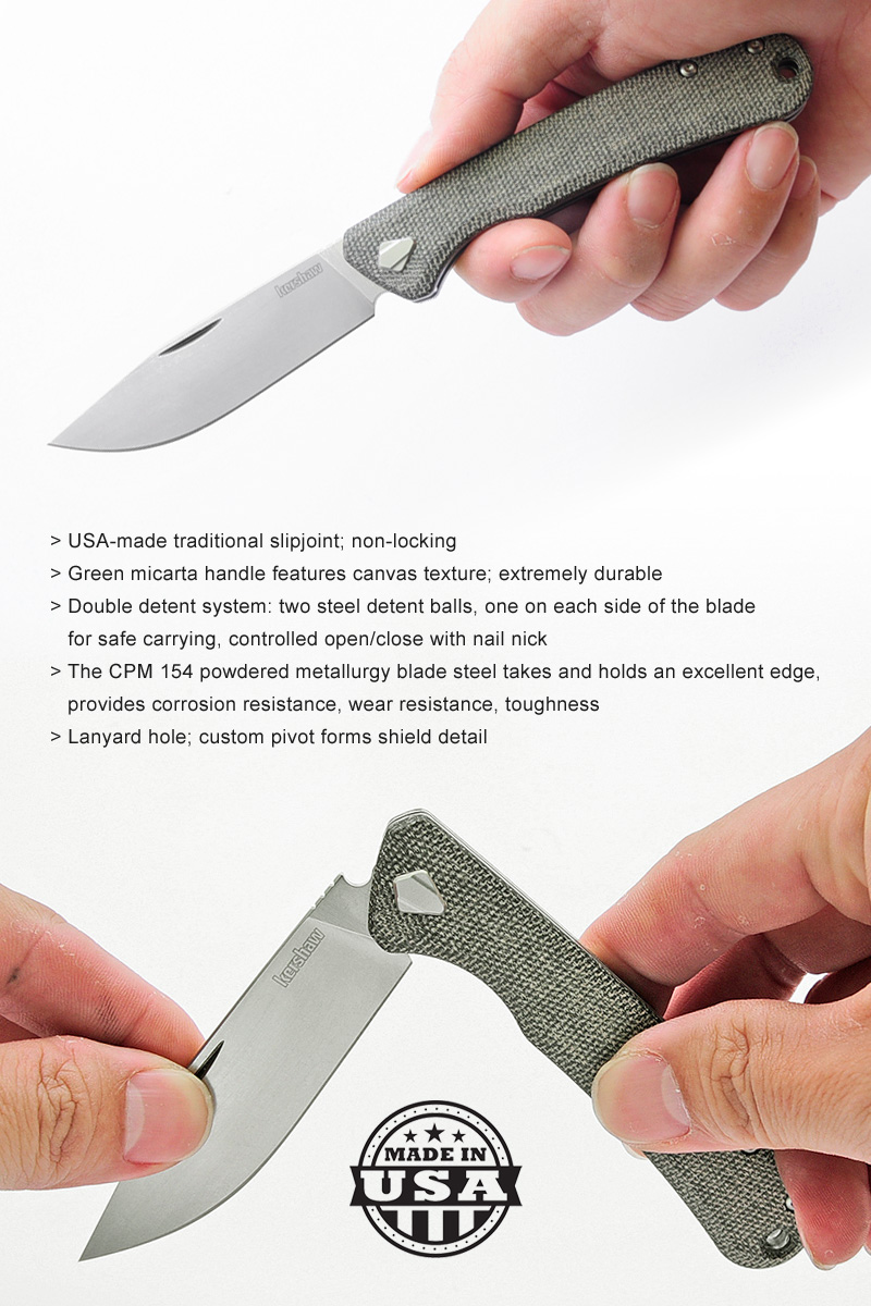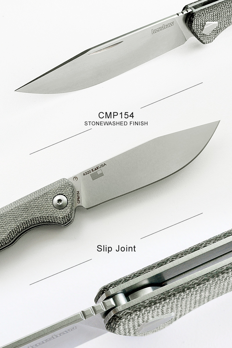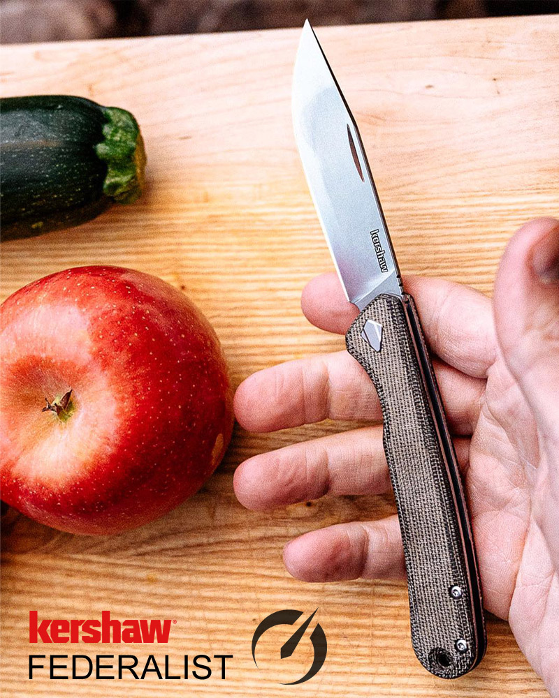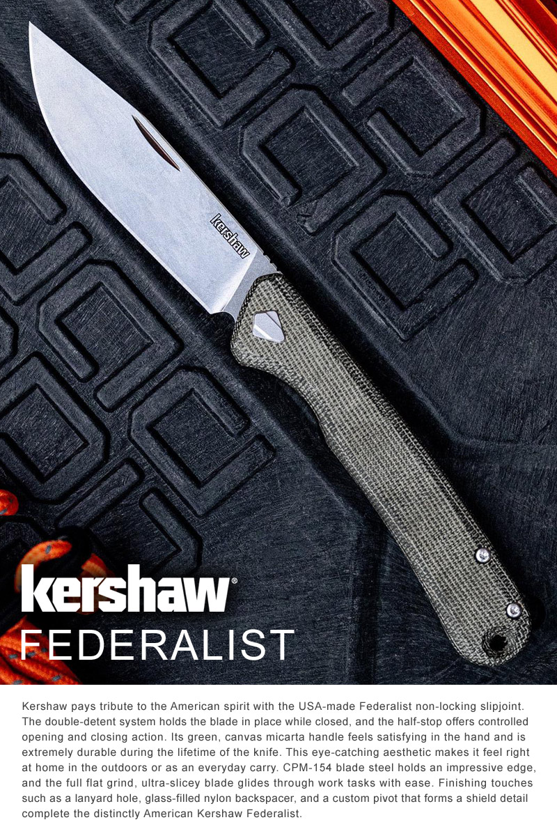 Kershaw 以美國製造的 Federalist 無鎖定slipjoint向美國精神致敬。 雙止動系統在關閉時將刀片固定到位,半擋塊提供可控的打開和關閉動作。 它的綠色帆布米卡塔手柄手感令人滿意並非常耐用。 這種引人注目的美感讓它在戶外或日常攜帶時感覺就像在家裡一樣。 CPM-154 刀刃鋼擁有令人印象深刻的鋒利度,全平刃研磨、超薄刀片輕鬆完成工作任務。 掛繩孔、玻璃填充尼龍後擋片和盾牌型樞軸外觀等最後的修飾完成了明顯的美國Kershaw聯邦黨人。