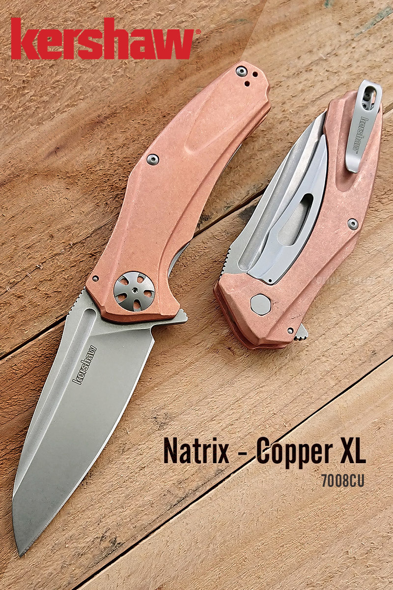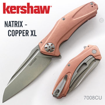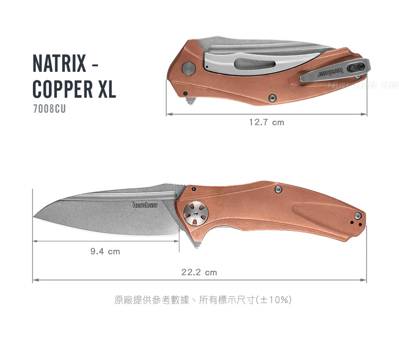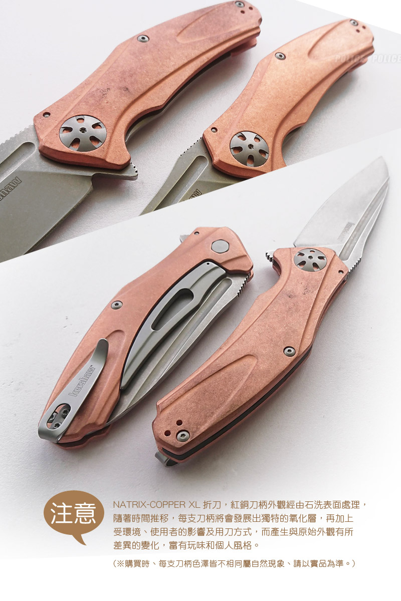 ※注意:NATRIX-COPPER XL折刀,紅銅刀柄外觀經由石洗表面處理,隨著時間推移,每支刀柄將會發展出獨特的氧化層,再加上 受環境、使用者的影響及用刀方式,而產生與原始外觀有所 差異的變化,富有玩味和個人風格。 (※購買時、每支刀柄色澤皆不相同屬自然現象、請以實品為準。)