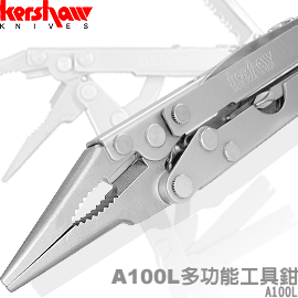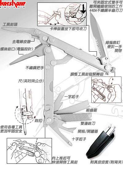 歷史悠久的 Kershaw工具鉗,俗稱"壓力鉗",主要用途為固定物品。首先就外觀而言,後身刻有U.S PAT 6006385專利字號。右邊鉗頭內部份的狹長溝槽能用來拔魚鉤。兩邊鉗頭內部份的電腦設計齒能更咬緊螺絲。鉗頭底部為金屬線剪,可剪鐵絲或電線皮(不能剪鋼釘)。工具鉗尾端有不鏽鋼片卡住六角螺絲上鎖裝置,此作用為鎖上或打開鉗子。左邊握把尾端有一凸出的不鏽鋼片,上面刻的箭頭意為往左推即可鬆開合緊的工具鉗。右邊握把尾端的旋轉鈕則是調整鉗口的大小,所以握把內並無設置工具,僅在外側有一把提供保險的440A半齒刃小刀。握把左側內共有5種功能的4把工具,依序為:一字起子與開罐器、細齒鋸、雙面銼刀、十字起子,而在左邊握把外殼刻有公釐尺與英吋尺。 另外,所附的真皮皮套有一背夾 讓您能隨身攜於身上任何的口袋中、背包的小袋子等等 … 相當方便輕巧!