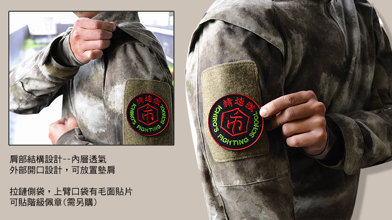 雙拉鏈,上臂口袋有毛面貼片,可貼上階級佩章