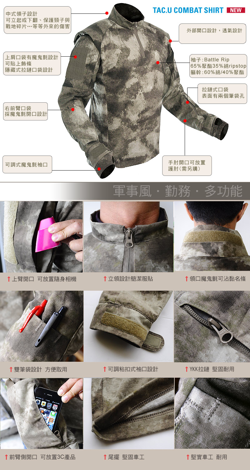 TAC. U 戰鬥衫是在著盔甲的重量下,讓你穿的舒適,輕量針織芯溼氣遠離您的軀幹並抗菌布料,預防細菌生長,減少異味產生。每一個細節於袖子上,提供您功能性,與您在傳統制服外套會得到的相同,如方便使用的拉鏈口袋。與鉸接手肘與獨特的雙層彈性肩膀,你不會再感覺到受限了 !