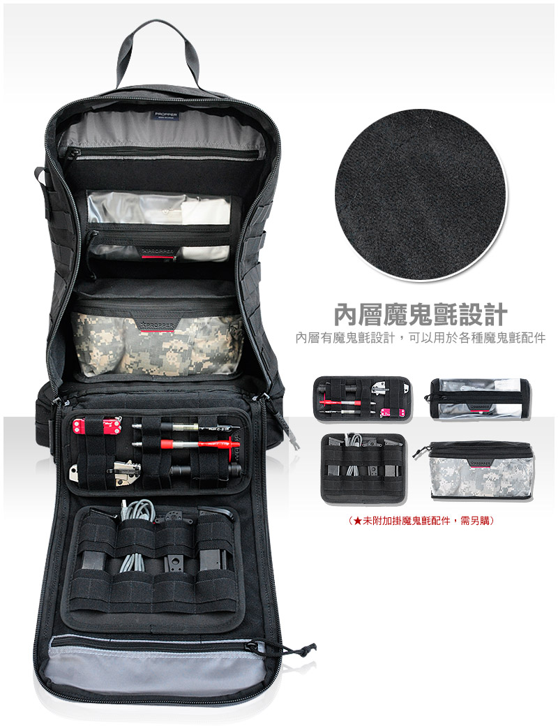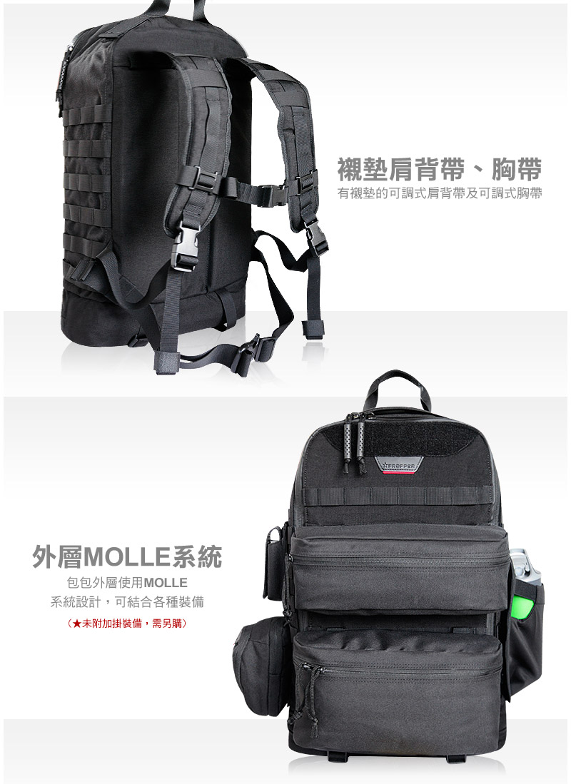 •包包外層使用MOLLE系統設計,可結合各種裝備